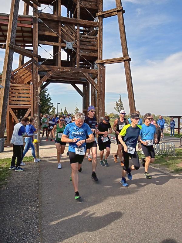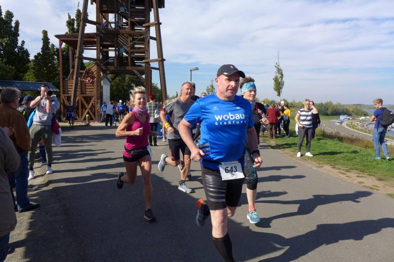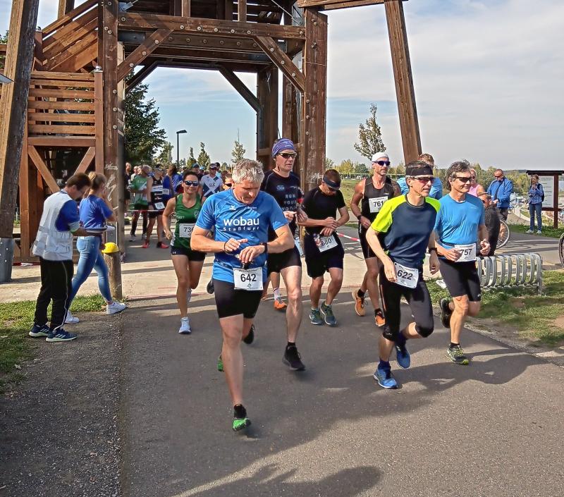 Erstaunlich ruhig und bei bestem Laufwetter präsentierte sich der Geiseltalsee am Feiertag der Deutschen Einheit. Da waren die Bode-Runners der Gaensefurther Sportbewegung in den zurückliegenden Jahren schon ganz anderen Wetterkapriolen ausgesetzt. Erste Aktion war also ein Gruppenfoto vor der beeindruckenden Kulisse. Kaum vorstellbar, das noch bis in das Jahr 2010 eine 16 Kilometer lange Pipeline den Geiseltalsee mit Saalewasser flutete. Als Veranstalter hatte der SV Braunsbedra das Hygienekonzept fest im Griff und konzentrierte sein Augenmerk auf die Durchführung der drei Hauptstrecken über 6,5 Kilometer, elf und 21,1 Kilometer.