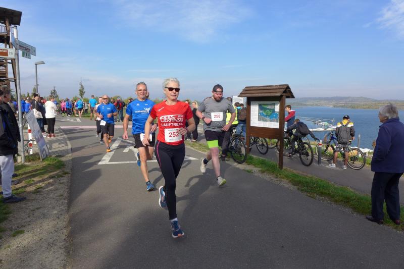Genau 100 Teilnehmer nahmen im Anschluss die Distanz über elf Kilometer in Angriff. Da war "Angriff" wohl auch die richtige Umschreibung, denn bei Kilometer zwei verließen die Läufer den Rundweg und quälten sich eine 1,5 Kilometer lange Steigung nach oben. Die Belohnung ließ nicht lange auf sich warten, denn zum Glück ging es nach einer Schleife dort auch wieder hinunter. Die Streckenführung folgte jetzt der Kurzdistanz und vom südlichsten Punkt des Geiseltalsees gelang nun immer wieder der Blick auf die fast 200 Meter lange Seebrücke. Edgar Schmidtke, der sich noch auf den Berg gefreut hatte, beendete diesmal ohne Umwege seinen Wettkampf und war der schnellste Bode-Runner (2. Platz Altersklasse M55). Nur 80 Sekunden später überquerte Kirsten Geist (Altersklasse W55) als Gesamtsiegerin der Frauen die Ziellinie. Eine erstaunliche Laufleistung und über zwölf Minuten Abstand, ehe sich die Altersklassenkonkurrenz auf den weiteren Plätzen anschloss.