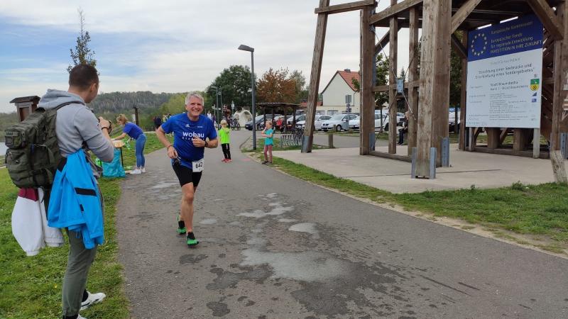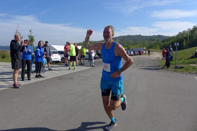 Erst um die Mittagszeit erfolgte der Aufruf für die 225 Halbmarathonis. Die Erwärmung ersparten sich die drei Lauffreunde Olaf Bothe, Jan Zaschke und Jens-Uwe Börner, denn die ellenlange Treppe hinauf zum Startpunkt war vollkommen ausreichend. Sie hatten auf die Länge von 21,1 Kilometer nicht unbedingt trainiert und auch die Zielzeit war fast nebensächlich. Wahnsinnig scharf war man allerdings auf die tolle Glasmedaille. In Bothe reift außerdem das Langzeitprojekt Frühjahrs-Marathon, so dass ein Test über die halbe Distanz ein erster Meilenstein war. „Da begleiten wir dich Kumpel, den musst du nicht alleine laufen!", wurde die Anmeldung zum Geiseltalseelauf vor einigen Wochen fest gemacht. Doch durch Corona waren die drei in ganz unterschiedlichen Startgruppen eingeteilt, so dass jeder für sich alleine lief. Nach neun absolvierten Kilometern konnte man den Läufern nochmal in die Augen schauen, denn sie passierten erneut das Besucherzentrum Marina. Nun ging es in die andere Richtung nach Mücheln, wo wieder gewendet wurde. Vorbei an Neubiendorf nahm man den Schwung hinab zum Hafen bis in das ersehnte Ziel mit. Endlich wieder vereint, schnappte Börner nach Luft: „Ich dachte ich kriege euch noch für ein gemeinsames Zielfoto!“ Egal, gelang dies doch inklusive der wohl verdienten Glasmedaille auch nach dem Zieleinlauf. Schmerzlich vermisst wurden allerdings das leckere Kuchenbuffet und die sonst so festliche Siegerehrung im großen Veranstaltungszelt. Erst zu Hause am heimischen Rechner waren die Ergebnisse dann einzusehen.