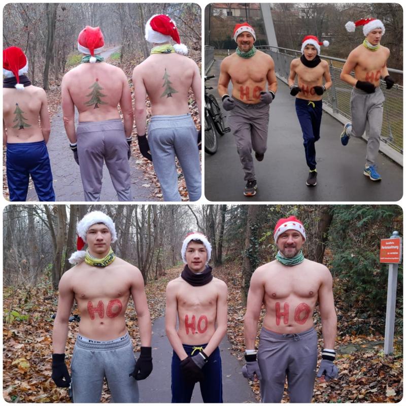 Bei vielen Teilnehmern geriet die Schnelligkeit zur reinen Nebensache, war doch auch eine Wertung für die originellsten Nikolauskostüme ausgeschrieben. Damit gestalteten sich sechs Kilometer teilweise schwierig, wichen bequeme Laufsachen mitunter Nikolausstiefeln und langen Rauschebärten. Mit so viel Kreativität hatte die verblüffte Jury nicht gerechnet und sich für die endgültige Platzierung Verstärkung geholt und um Zeitaufschub gebeten. Dass am Ende die Jungs mit dem „leichtesten“ Kostüm das Rennen machten, ließ manches Frauenauge strahlen. Sieht man vom aufgemalten „HO, HO, HO“ mal ab, waren die Oberkörper der drei Nikoläuse nämlich nackt. Zum Glück war unten herum alles warm verpackt und auch Nikolausmütze, Handschuhe und Schal verhinderten eine weitere Auskühlung und den kompletten Kollaps rein zufällig kreuzender Passanten. So ging das Konzept der drei Initiatoren auf, die neben reichlich Bewegung und frischer Luft auch noch die Lacher auf ihrer Seite hatten.