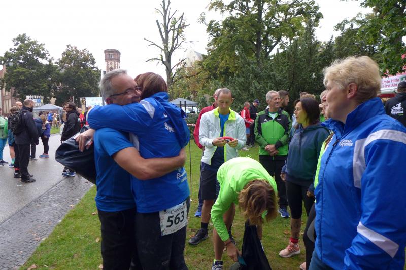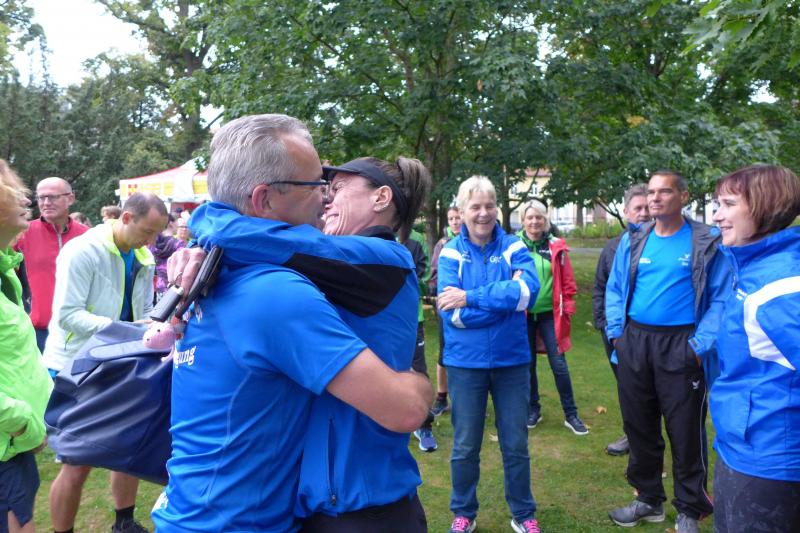 Die LSG Ascania schaffte mit ihrem neuen Start- und Zielbereich an der Herrenbreite eine besondere Atmosphäre zur 40. Jubiläumsauflage und bei der Größe der Parkanlage, war das pandemiebedingte Abstandhalten auch kein Problem. Nur den anhaltenden Regen hätten sich eine Woche zuvor wohl eher die Veranstalter der Genthiner Matschwolke gewünscht. Aber bekanntlich kommen ja nur die Harten in den Garten und so pfiff Paparazzi Börner seine Bodis im feinsten Nieselregen zur Fotoaufstellung vor dem Startbogen zusammen. „Leute, die Matten sind scharf!“, hallte es aus dem Messwagen der Zeiterfassung. Wie ein aufgescheuchter Hühnerhaufen sortierten sich die Lauffreunde entfernt der verlegten Messschleife neu, denn ein Kontakt hätte die Ergebnislisten der bereits gestarteten Walker arg durcheinander bringen können. Schnell noch ein Geburtstagsständchen für den Jürgen, der sich sehr über die vorgezogenen Starts und die damit näher rückende Kaffeerunde freute. Nahe am Ehekrach schrammte ein Bode-Runner-Pärchen vorbei, die es gerade noch schafften ihre Startunterlagen abzuholen: „Du musst auf die Laufstrecke!“, schickte sie den Gatten los, der nun zwölf Kilometer vor sich hatte, um das angestaute Adrenalin abzulaufen. Bei all der Aufregung geriet fast der Start von Debütantin Anke Delius ins Hintertreffen. Wie ein Routinier reihte sie sich aber in die lange Startaufstellung ein und zog ihre sieben Kilometer ruhig und ohne Gehpausen durch. Das kontinuierliche Training mit der Laufgruppe zeigte erste Erfolge und Delius lief nicht ohne Stolz über die Ziellinie. Nach langer Verletzungspause und mit etlichen Gehpausen über diese Distanz, war Sabine Börner wieder mit von der Partie. Einzig allein der dadurch errungene Mannschaftspunkt war das Ziel. Doch das gute Mannschaftsgefühl und die Tatsache, dass es langsam wieder aufwärts geht, waren allemal Lohn für die Quälerei. In Bestform und als schnellste Gaensefurtherin auf der Sieben-Kilometer-Distanz unterwegs, spulte Janine Wuwer ihr Rennen ab. „Das ist mein Wetter!“, freute sich die Sportlerin dann auch noch über ihren ersten Platz in der Altersklasse W40. Als „langer Kanten“ musste beim Jubiläumslauf die 18,5 Kilometer lange Strecke reichen. Führte 2019 der 25-Kilometer-Kurs noch über die Burg Arnstein, ging es diesmal schon kurz vor Welbsleben zurück, oft am Flüsschen Eine entlang, direkt wieder in das Zentrum von Aschersleben. Okay, die Strecke war kürzer aber dennoch sehr anspruchsvoll. So berichteten einige Finisher, dass sie auf Grund der Nässe die Wegmarkierungen nicht erkannten und dadurch einige Kilometer mehr zusammen kamen. Die aufgeweichten Sommerwege sorgten indes für abenteuerliche Rutschpassagen. Umso intensiver waren die Erfolgserlebnisse und die Streckenberichte dann im Ziel.