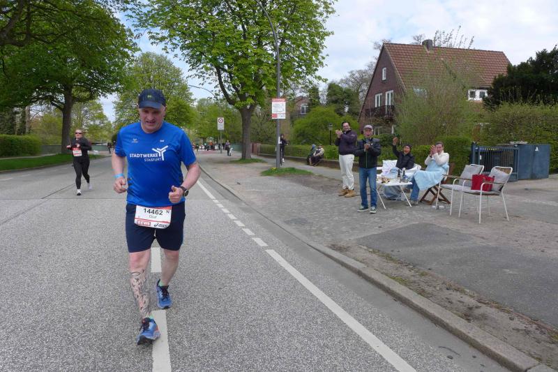 Nach coronabedingter Zwangspause im vorigen Jahr, war der Startplatz für Bothe in 2022 quasi reserviert. Da mussten die aktuellen Wettkämpfe erstmal mit dem Trainingsplan abgestimmt werden. Doch der Halbmarathon in Berlin und ein abschließender 30 Kilometer-Lauf auf heimatlichen Wegen, waren dann Vorbereitung genug. "Bist du aufgeregt?", fragte der mitgereiste Fanclub nach dem Einchecken im Hotel? "Nicht die Bohne", lauschte Bothe in sich hinein. Spätestens als er dann die Startnummer in den Händen hielt, stieg die Anspannung auch bei dem Debütanten. Über die Streckenlänge von 42,195 Kilometer ist Bothe noch nie am Stück gelaufen. Durchhalten und ankommen war das ausgemachte Ziel, eine Zeitvorgabe wollte Bothe sich nicht machen. Während dem Lauffreund frühzeitiges Zubettgehen ans Herz gelegt wurde, studierte Jens-Uwe Börner U-Bahn-, Zeit- und Streckenpläne entlang des Marathons. Mit einer Tageskarte der Bahn, ließ sich der zuschauerfreundliche Kurs mehrfach ansteuern. War das Läuferfeld erstmal unterwegs, hatte Börner insgesamt fünf Zwischenstationen ausgemacht, um Bothe an der Strecke abzupassen, ein Stück mitzulaufen und mit zunehmenden Kilometern natürlich zu motivieren. Und dann war Bothe endlich unterwegs. Die Tränen von Ehefrau Nancy trockneten andere Bode-Runners: "Er schafft das! Er ist gut trainiert und er hat Spaß auf der Strecke!", beruhigten die Lauffreunde, nachdem der Startschuss so viele Emotionen freigesetzt hatte. Wie vereinbart, verteilte sich die mitgereiste Fangemeinde an der 42 Kilometer langen Partyzone. Nachdem die Führungsfahrzeuge für die Profis auf der Strecke Platz gemacht hatten, folgte der nicht abreißende Strom der Volksläufer. Da brauchten auch die zahlreichen Zuschauer an der Strecke eine ordentliche Portion Ausdauer für ihr Motivationsprogramm. Bei den ersten beiden Anlaufpunkten hatte Börner Glück, denn Bothe war eigentlich zu schnell unterwegs und viel zu zeitig am anvisierten Streckenpunkt. Die Stimmung war einmalig: „Adrenalin ohne Ende!“, klatschte Bothe seinen Streckenmotivator ab und ließ sich vom Strom mitziehen. Reeperbahn und Elbchaussee lagen hinter ihm, als mit den Landungsbrücken ein weiteres Highlight anstand. Die Familie konnte das Oberhaupt in der Menge ausfindig machen und feierte ihn noch vor der imposanten Elbphilharmonie. Hafencity und Speicherstadt durften nicht fehlen, bevor Bothe von der Kennedybrücke den tollen Blick über die Binnenalster wahrnahm.