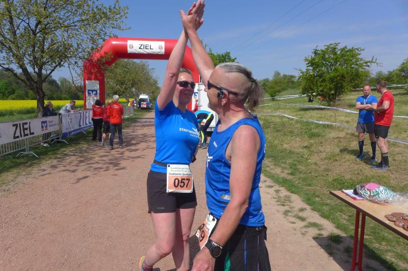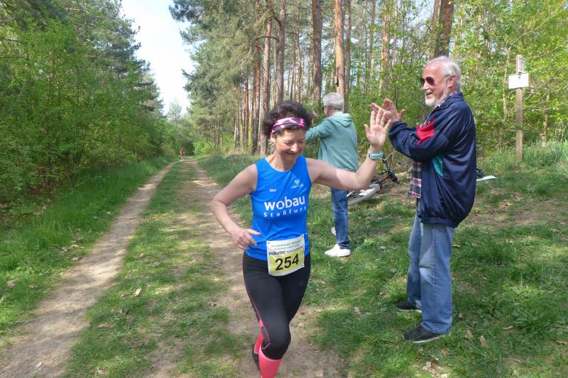 Bereits am nächsten Tag waren die Gaensefurther wieder mal beim befreundeten PSV Bernburg zu Gast. Dieser hatte zum 5. Bernburger Halbmarathon geladen, der zudem in die Wertung für den Solvay Cup einging. Mit Triathlet Maik Löwe, Josef Hindricks, Rinaldo Schielke, Sandra Homann, Edgar Schmidtke, Katrin Winkler-Hindricks, Heike Lenz, Jens-Uwe Börner, Verena Hildebrandt, Peter Brauer, Petra Becker und Jürgen Günther schickten die Bode-Runners ein zwölfköpfiges Aufgebot in die Kreisstadt. Dort konnten Strecken über zwölf beziehungsweise 21,1 Kilometer absolviert werden. Besonders Schielke ging dabei wieder fleißig auf Punktejagd und wurde in 1:36:49 Stunden über die Halbmarathon-Distanz Gesamtzwölfter und Dritter seiner Altersklasse M30. Am Streckenrand gab es zudem das eine oder andere bekannte Gesicht zu sehen, denn die Streckenposten vom PSV Bernburg waren für die Bode-Runners natürlich keine Unbekannten.