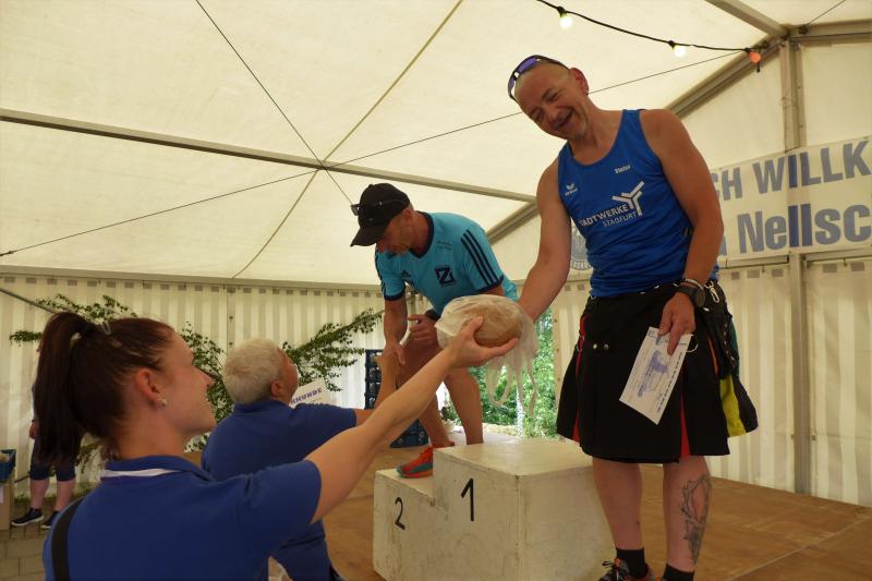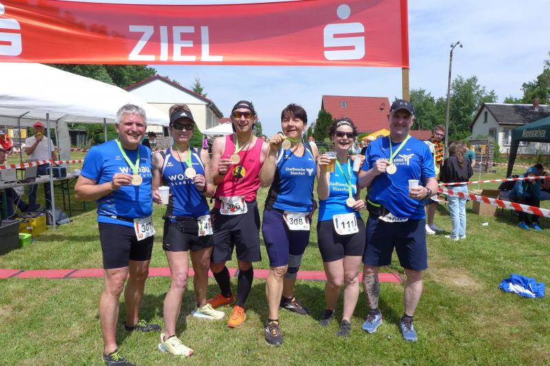 Doch keine Gnade für die Wade, rief die SFG Nellschütz am Pfingstmontag zum 20. Gerstewitzer Mühlentaglauf auf. Hier sollte nochmal der Mannschaftsgedanke motivieren, ging es doch im Rahmen des Landescups nicht nur um wichtige Wertungspunkte, sondern war für die stärkste Truppe auch ein Fass Bier ausgeschrieben. Immerhin 13 Bode-Runners nahmen die weite Anreise nach Nellschütz auf sich. „Na die 13 hat uns schon beim Salzland-Lauf Glück gebracht!“, erinnerten sich die Bode-Runners an die Diskussion über eine Veranstaltung an einem Freitag dem 13. Doch schon bei Abholung der Startunterlagen wurde deutlich, dass es eine ganz knappe Sache mit den antretenden Füchsen aus Hassenhausen werden würde. Die Auflösung blieb bis zum Schluss spannend, denn zuerst galt alle Kraft den Laufstrecken. Ganz Nellschütz war an der Strecke um die Läufer anzufeuern und mit lautem Kirchturmgeläut wurde dem benachbarten Gerstewitz signalisiert: „Die Läufer sind jetzt los!“ Mitten im Getümmel auch Neuzugang Conny Günther, die sich die Sechs-Kilometer-Distanz als erste Wettkampfstrecke mit den Bode-Runners ausgesucht hatte. „So aufgewühlt hab ich dich nie gesehen!“, sang man noch den Klaus-Lage-Song mit ihr, um die Aufregung ein wenig zu nehmen. Ganz tapfer absolvierte die Debütantin Schritt für Schritt, und spätestens nach der Umrundung der Gerstewitzer Mühle sah sie, wie viele Läufer ihr noch entgegen kamen. Nun gab es bis in das Ziel sogar frischen Rückenwind. Die lustigen Nellschützer hatten während dessen das eine oder andere Bierchen verdrückt und empfingen ihre Mühlentagläufer wieder mit motivierenden Sprüchen für den Endspurt. Das hat Eindruck hinterlassen, immerhin durften sich am Ende von den 13 angereisten Staßfurtern acht Altersklassengewinner ein frisch gebackenes Mühlenbrot vom Müllermeister abholen. Nun wurde es ganz still im großen Festzelt, denn die stärkste Mannschaft für das Bierfass sollte ermittelt werden! Was für eine Freude, als feststand, dass sich die weite Anreise für die Gaensefurther Sportbewegung auch in diesem Fall gelohnt haben sollte! Das Fass kommt genau richtig für die Abende des geplanten Trainingslagers und die 20-jährige Jubiläumsfeier der Laufgruppe Bode-Runners…
