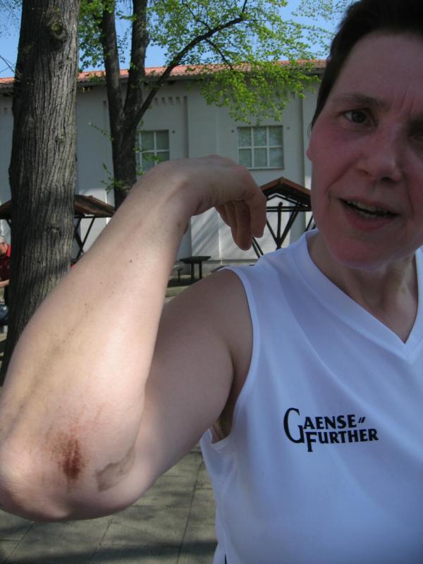 Inzwischen erfolgte schon der Start über die wald- und seenreiche 10, 7 Kilometer lange Strecke. Der Lauf war wunderschön, allerdings mussten die Aktiven schon konzentriert nach unten schauen, um nicht über die aus dem Boden herausragenden Wurzeln zu stolpern. Ralf Schmidtschneider aus Löderburg und Renate Liedtke gingen zu Boden und kamen mit blutigen Knien im Ziel an. Auch wenn der Lauf aus den Vorjahren bekannt war, knobelten die Läufer durch die vielen Kursänderungen wieder, wie viel noch bis zum Ziel zu laufen war. Nach mehr als neun Kilometern verkündete endlich ein Schild, dass man nur noch 1 000 Meter zurücklegen musste. Dann schaffte man es mit hängender Zunge noch zum Getränkestand, der bei Temperaturen von um die 20 Grad vergebens auf der Strecke erwartet wurde. Allerdings ging es allen Teilnehmern gleich.