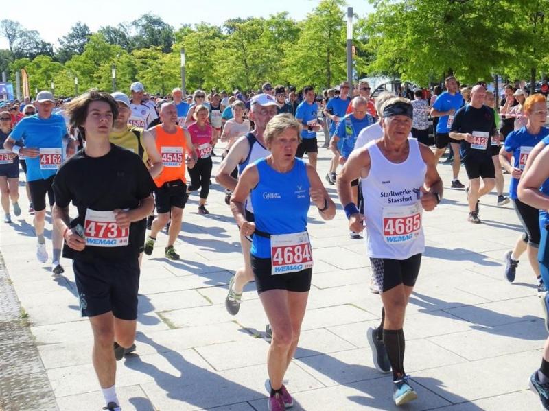 "Schon wieder kommt ein Gaensefurther ins Ziel!", hörten die Bode-Runners mit geschwollener Brust den Moderator gerne sagen, bevor die letzten Schritte bis zur Ziellinie unter dem Beifall der zahlreichen Zuschauer erfolgten. Immerhin strahlten 13 leuchtend blaue Shirts der Gaensefurther Sportbewegung mit der Schweriner Sonne bei warmen 26 Grad um die Wette. Das Ausdrücken der Laufuhr und der obligatorisch, auswertende Blick auf Zeit, Distanz und Durchschnittsgeschwindigkeit gehörte ebenso zum Ritual, wie das Abklatschen der Lauffreunde, mit denen man unterwegs so viele Kilometer gemeinsam gekämpft hatte.