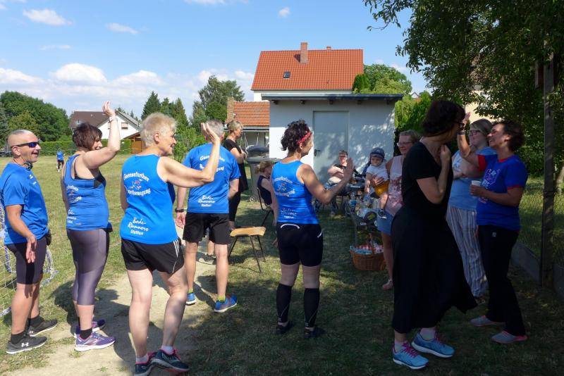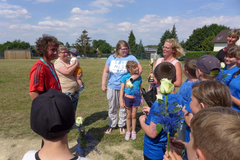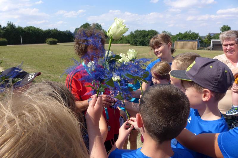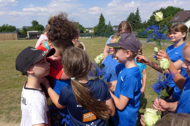 Einen tragischen Verlust muss indes die Kinder-Trainingsgruppe der Gaensefurther Sportbewegung verkraften. Mit den letzten Schultagen endete für die elf Kinder von sieben bis zehn Jahre das Training mit ihrer Silke. Der Umzug in eine andere Stadt ist leider nicht abzuwenden. Dabei hatte sie mit Überbringung dieser traurigen Tatsache wohl am meisten zu kämpfen. Als die Kinder und Eltern die langjährige Übungsleiterin zur letzten Trainingseinheit nun mit einer kleinen Abschiedsfeier überraschten, nahmen die Tränen ihren Lauf. Jedes Kind verabschiedete sich mit einer Rose, natürlich in den Gaensefurther Vereinsfarben blau/weiß. Ein Erinnerungs-T-Shirt für die beste Trainerin der Welt und ein Pokal durften natürlich nicht fehlen. Auch Vertreter der Laufgruppe überbrachten im Namen des Vorstandes ein kleines Dankeschön für die wichtige Arbeit mit den Kids. Silke Vorrath versteht es gut, das Einmaleins der Leichtathletik neigungs-, altersgerecht und spielerisch zu vermitteln. Mit den Sportanlagen rund um die Hecklinger Grundschule hat die temperamentvolle Kindergruppe auch alle Möglichkeiten für ein abwechslungsreiches Training. Doch wie kann es nun weitergehen? Diese Frage wüsste auch Vorrath allzu gerne beantwortet. Im Moment steht ein Übungsleiter-Papa in den Startlöchern, der erstmal alle 14 Tage das Dienstagstraining übernehmen wird. Freiwillige vor, die Gaensefurther Sportbewegung und allen voran die Kinder-Leichtathletikgruppe, sucht dringend nach ein, besser zwei tatkräftigen Unterstützern. Interessenten melden sich sehr gerne direkt bei der Kindergruppe, die immer dienstags ab 15:30 Uhr trainiert oder per E-Mail bei den Bode-Runners unter laufgruppe@gaensefurther-sportbewegung.de, damit ein kräftiges "Sport frei!" weiterhin für Begeisterung bei dem Sportlernachwuchs sorgt...