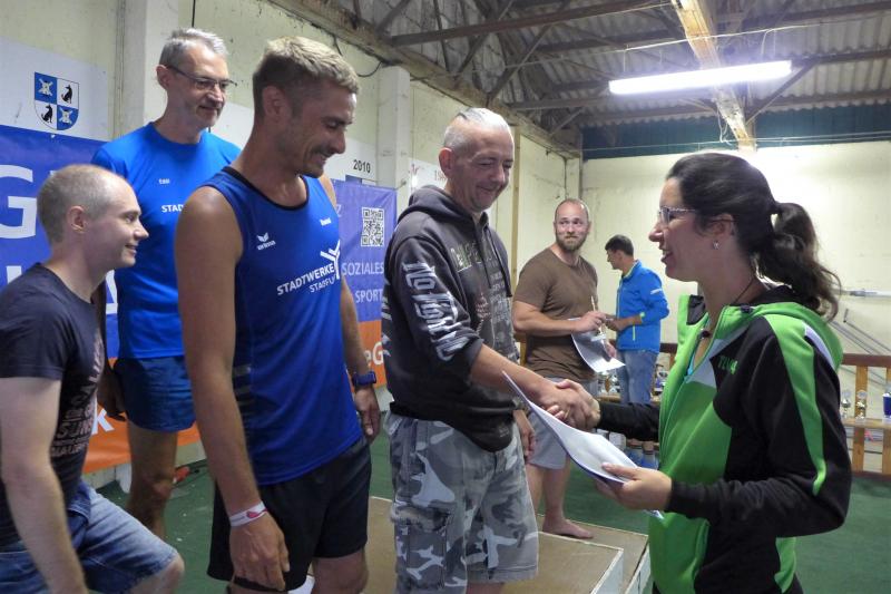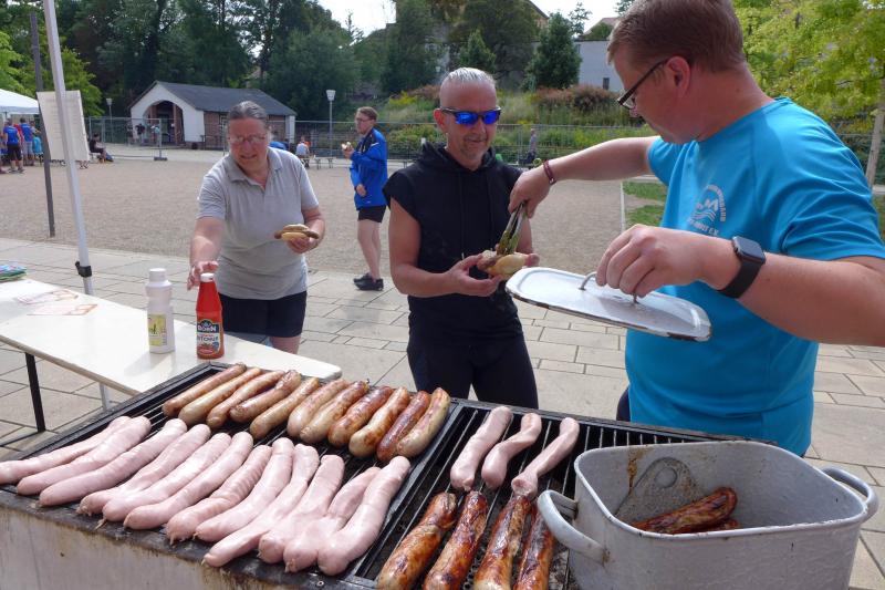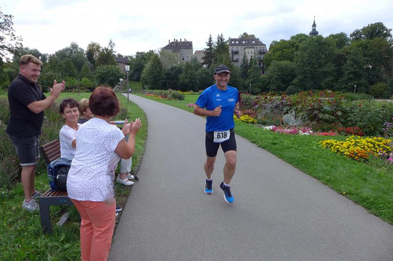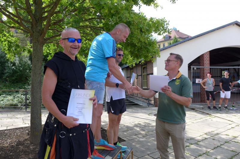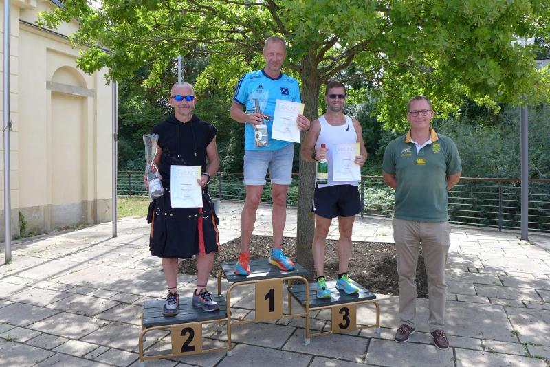 Für einige Bode-Runners der Gaensefurther Sportbewegung war die Nacht kurz, fiel der erste Startschuss zum elften Cuplauf in der Novo-Nordisk-Wertungsserie im weit entfernten Zeitz bereits um zehn Uhr. Ein paar Teilnehmer mehr hätte sich die SG Chemie Zeitz schon gewünscht, zumal die Veranstaltung als Landescup ausgetragen wurde. Die Damen gingen zuerst auf ihre fünf Kilometer, die Herren absolvierten eine Stunde später die doppelte Distanz. Der schnelle, kurvige Kurs durch den Schlosspark Moritzburg und das leidenschaftliche Anfeuern durch die Vereinskollegen, ließ den Puls von Anfang an höher schlagen. Einen wahren Krimi verfolgte man an der Strecke über zehn Kilometer bei Stefan Sindermann, der sich zum ersten Mal seinen unmittelbaren Konkurrenten Heiko Naumann vom SV Glauzig vornahm. "In Schierke war ich schon dicht dran, heute greife ich an!", puschte sich der Sportler bereits vor dem Startschuss. Da hätte vor lauter Animation Daniel Wuwer doch fast seine eigene Siegerehrung verpasst. Nur ein Sprint zum Siegerpodest rettete seine Ehrung über Platz zwei in der Altersklasse M40 über die fünf Kilometer. Sindermanns Schottenrock kam diesmal auch erst auf dem Podest zum Einsatz, mit dem er stolz auf Platz zwei vor Naumann seinen Preis in Empfang nahm.