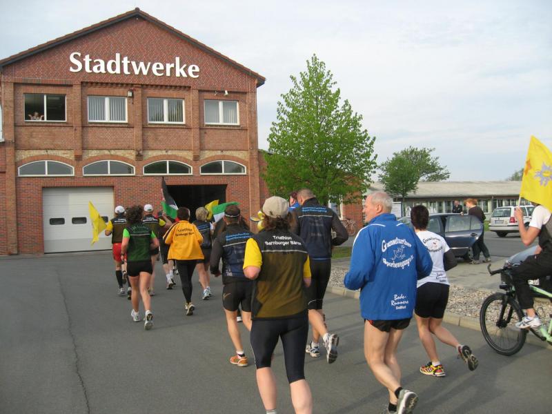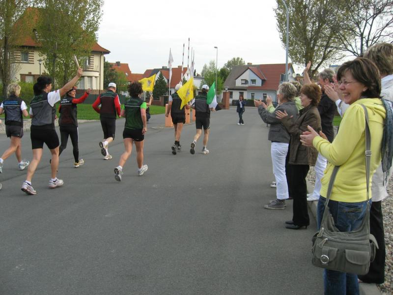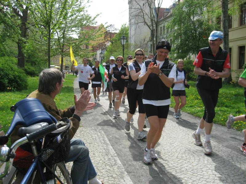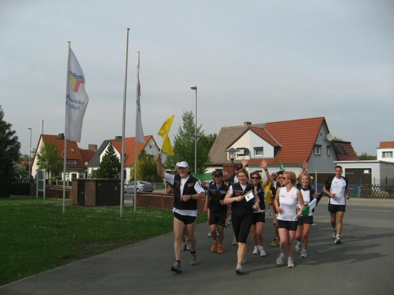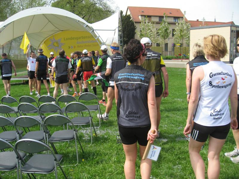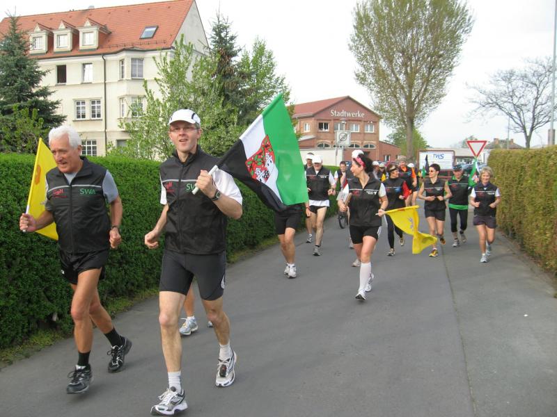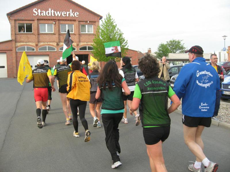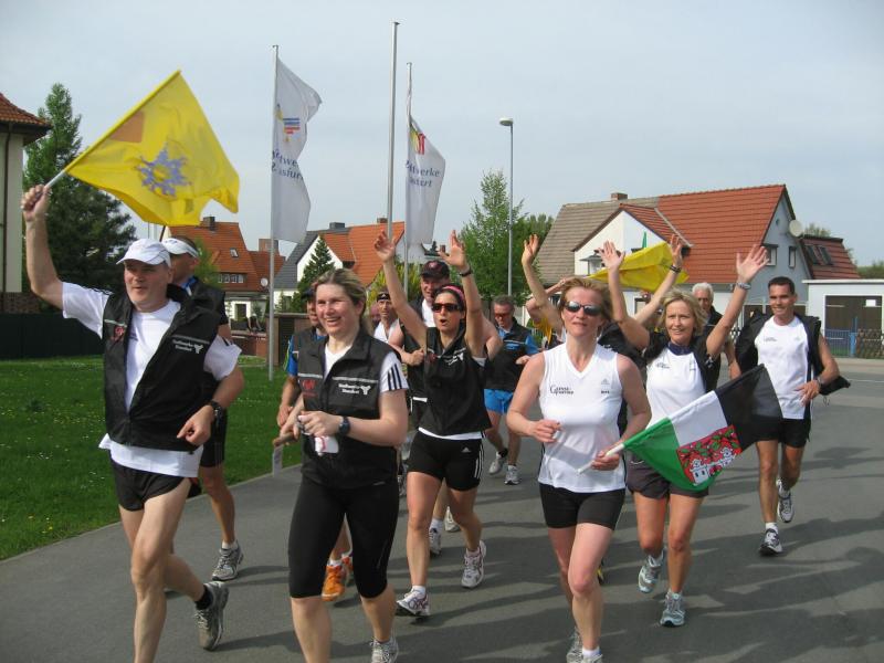Nachdem sich zu früher Stunde bereits eine große Gruppe von Läufern der beteiligten Laufgruppen vor der Gaensefurther Schlossbrunnen Wüllner GmbH eingefunden hatte, verabschiedete deren Geschäftsführer Horst Braunisch die Teilnehmer, nicht aber ohne ihnen einen PKW voll mit erfrischendem Naß mit auf die Reise zu geben. Über die Roßbahn ging es dann zur 1. Etappe nach Staßfurt zu den Stadtwerken, wo die Läufer schon von OB René Zok und Betriebsangehörigen erwartet wurden. Die Übergabe der Staffelstäbe und die Einnahme einer kleinen Wegzehrung hingegen mussten zügig abgewickelt werden, hatte man doch durch einen Termin bei der LAGA in Aschersleben einen straffen Zeitplan vorgegeben. Wenn die Landesgartenschau für die älteste Stadt Sachsen-Anhalts das absolute Highlight des Jahres ist, warum nicht auch in den diesjährigen Stadtwerkelauf einbinden, dachten sich die Läufer von Ascania Aschersleben und sorgten damit für eine nette Bereicherung der Tagesplanes. Bei warmen, aber angenehmen Wind ging es weiter nach Bernburg, entlang der Bode und der Saale, deren Auen sich frühlingshaft geschmückt zeigten. Schon allein dieses Flair entschädigte für so manche Strapazen. In Bernburg bei den Stadtwerken angekommen, folgte dann der gewohnt herzliche Empfang mit Übergabe der Grußbotschaften, ergänzt durch einen leckeren Imbiß und weiter ging’s. An Verpflegung unterwegs mangelte es ebenfalls nicht. Die von Gaensefurther gesponserten Getränke und die Lunchpakete vom Speiseservice RiRo ließen diesbezüglich fast keinen Wunsch offen. Hatte trotz alledem ein Aktiver konditionelle Probleme, konnte er sich in einem der vier Begleitfahrzeuge erholen. 2 Sportler mussten leider ihren Plan, die gesamte Strecke durchzulaufen, nach 50 km aufgeben, denn das hohe Lauftempo forderte seinen Tribut. Bei dieser Eile übersah dann in den engen Promenaden von Aschersleben prompt ein Läufer einen Poller und es kam zu einer schmerzhaften Kollision. Aber zum Jammern blieb wenig Zeit, denn die Landesgartenschau wartete. Auf der Bühne im Weingarten war dann einige Prominenz versammelt und mittendrin unsere Helden mit den flinken Beinen, überwältigt vom folgenden Blitzlichtgewitter. Nachdem die eigentliche Mission des Laufes, die Übergabe einer Grußbotschaft auch an die Stadtwerke Aschersleben abgehandelt war, die die gute Zusammenarbeit auf kulturellem, wirtschaftlichen und natürlich sportlichem Gebiet dokumentieren soll, folgte die letzte Etappe der insgesamt 70 km langen Strecke.
