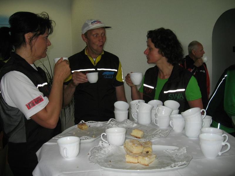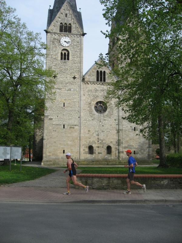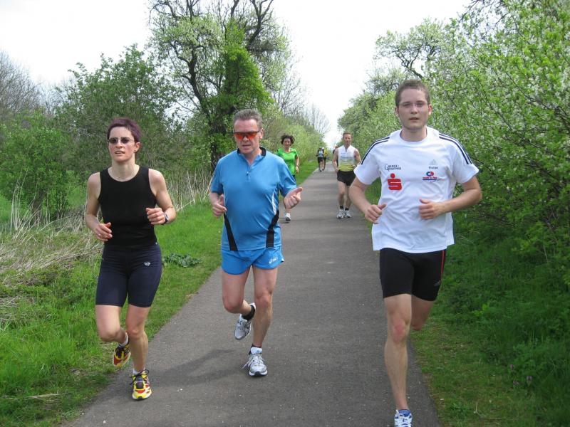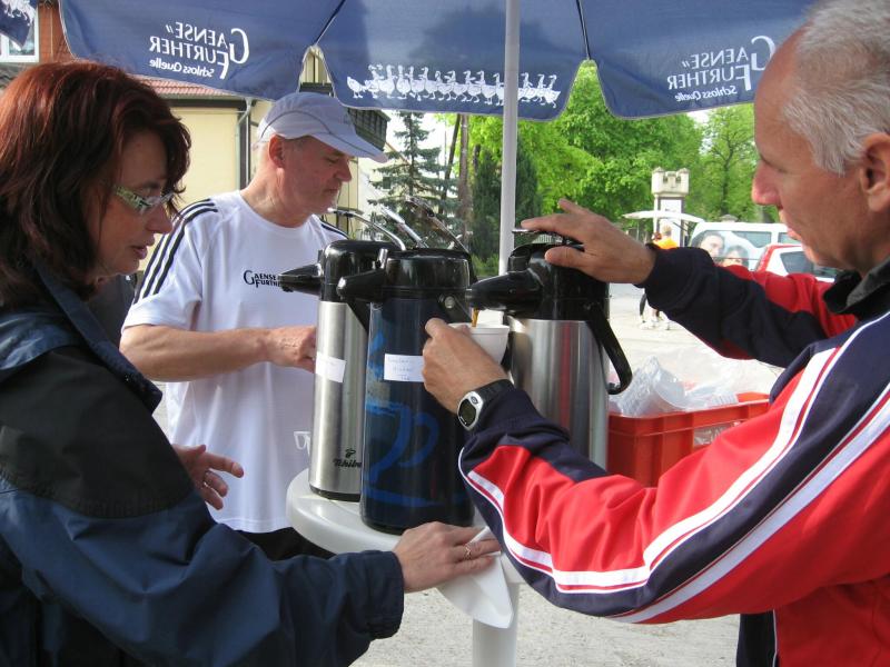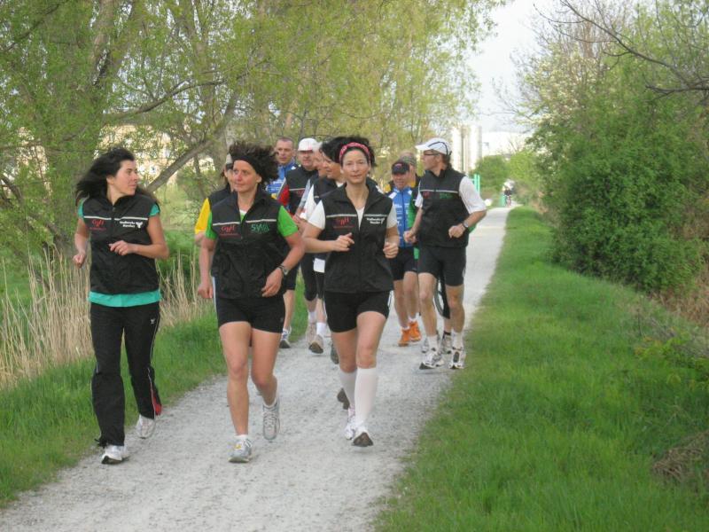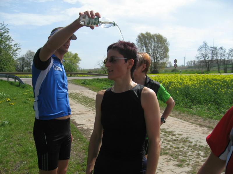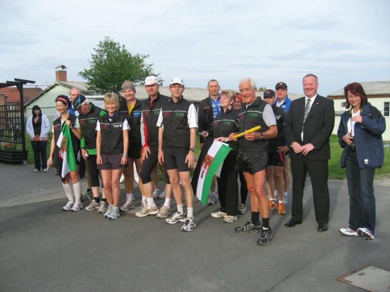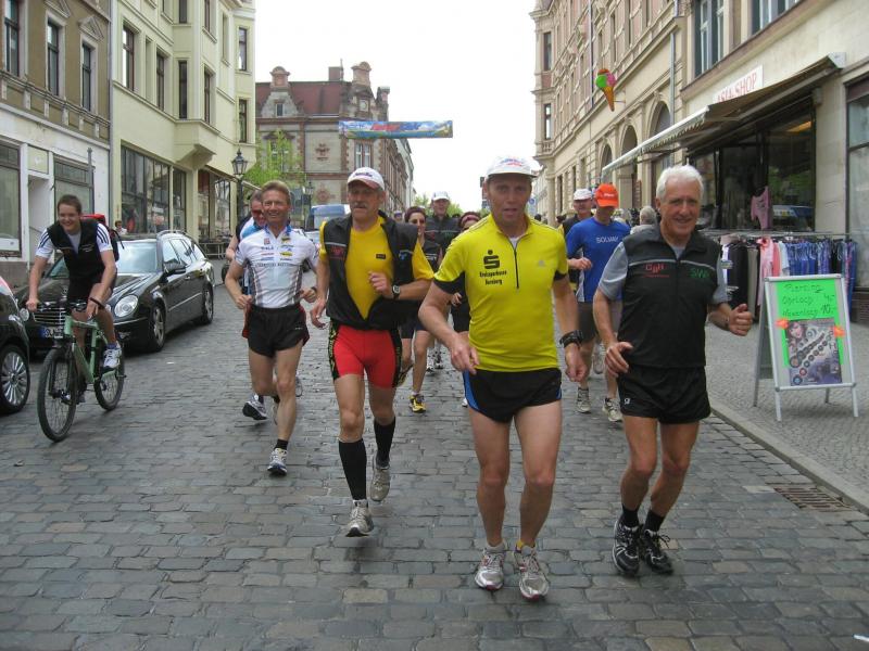 Nachdem sich zu früher Stunde bereits eine große Gruppe von Läufern der beteiligten Laufgruppen vor der Gaensefurther Schlossbrunnen Wüllner GmbH eingefunden hatte, verabschiedete deren Geschäftsführer Horst Braunisch die Teilnehmer, nicht aber ohne ihnen einen PKW voll mit erfrischendem Naß mit auf die Reise zu geben. Über die Roßbahn ging es dann zur 1. Etappe nach Staßfurt zu den Stadtwerken, wo die Läufer schon von OB René Zok und Betriebsangehörigen erwartet wurden. Die Übergabe der Staffelstäbe und die Einnahme einer kleinen Wegzehrung hingegen mussten zügig abgewickelt werden, hatte man doch durch einen Termin bei der LAGA in Aschersleben einen straffen Zeitplan vorgegeben. Wenn die Landesgartenschau für die älteste Stadt Sachsen-Anhalts das absolute Highlight des Jahres ist, warum nicht auch in den diesjährigen Stadtwerkelauf einbinden, dachten sich die Läufer von Ascania Aschersleben und sorgten damit für eine nette Bereicherung der Tagesplanes. Bei warmen, aber angenehmen Wind ging es weiter nach Bernburg, entlang der Bode und der Saale, deren Auen sich frühlingshaft geschmückt zeigten. Schon allein dieses Flair entschädigte für so manche Strapazen. In Bernburg bei den Stadtwerken angekommen, folgte dann der gewohnt herzliche Empfang mit Übergabe der Grußbotschaften, ergänzt durch einen leckeren Imbiß und weiter ging’s. An Verpflegung unterwegs mangelte es ebenfalls nicht. Die von Gaensefurther gesponserten Getränke und die Lunchpakete vom Speiseservice RiRo ließen diesbezüglich fast keinen Wunsch offen. Hatte trotz alledem ein Aktiver konditionelle Probleme, konnte er sich in einem der vier Begleitfahrzeuge erholen. 2 Sportler mussten leider ihren Plan, die gesamte Strecke durchzulaufen, nach 50 km aufgeben, denn das hohe Lauftempo forderte seinen Tribut. Bei dieser Eile übersah dann in den engen Promenaden von Aschersleben prompt ein Läufer einen Poller und es kam zu einer schmerzhaften Kollision. Aber zum Jammern blieb wenig Zeit, denn die Landesgartenschau wartete. Auf der Bühne im Weingarten war dann einige Prominenz versammelt und mittendrin unsere Helden mit den flinken Beinen, überwältigt vom folgenden Blitzlichtgewitter. Nachdem die eigentliche Mission des Laufes, die Übergabe einer Grußbotschaft auch an die Stadtwerke Aschersleben abgehandelt war, die die gute Zusammenarbeit auf kulturellem, wirtschaftlichen und natürlich sportlichem Gebiet dokumentieren soll, folgte die letzte Etappe der insgesamt 70 km langen Strecke.