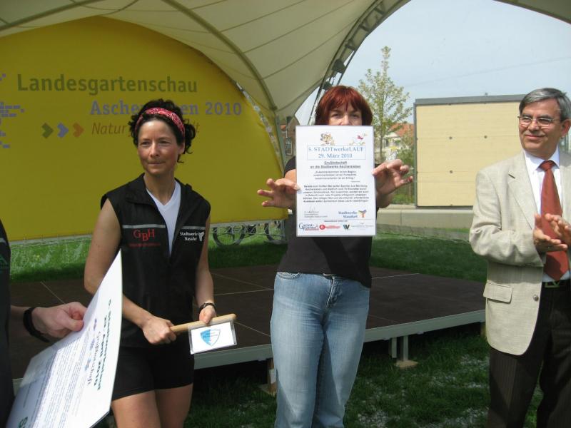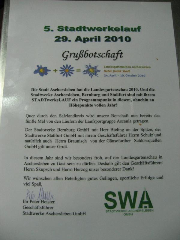 „Gartenschauen sind Akzeptanzkatalysatoren. Hier in Aschersleben natürlich für die Stadt, den gärtnerischen Berufsstand und die politische Ordnungseinheit des Salzlandkreises. Und genau an dieser Nahlinie kommen Gartenschau und STADTwerkeLAUF zusammen. Beide werben eigentlich für die gleiche Sache“, so Jürgen Herzog, „grüner“ Geschäftsführer der Landesgartenschau Aschersleben 2010 GmbH auf der Bühne bei der Verkündung der Botschaft. Peter Heister, der Geschäftsführer der Stadtwerke Aschersleben, einer der Hauptsponsoren des STADTwerkeLAUFs, sieht das ähnlich. „Wir sind gern dabei, wenn es um eine gute Sache geht und Menschen für etwas begeistert werden können.“