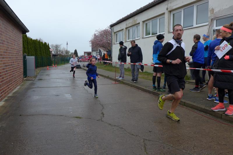 Zeitgleich und durchaus auch bergig, nahmen 150 Kilometer entfernt, sechs weitere Gaensefurther den bereits 41. Osterberglauf in Schlagenthin unter die Lupe: „Den wollte ich immer schon mal laufen!“, stöhnt Stefan Sindermann über den vollen Laufkalender und freut sich, dass es in diesem Jahr terminlich mal gepasst hatte. Der fleißige Volksläufer versucht alle drei ausgeschriebenen Lauf-Cups in Sachsen-Anhalt zu bedienen, was aber nicht einmal theoretisch umzusetzen wäre. Meist mit im Schlepptau die Familie Siebert mit Emily und Lotta, die in der Wertung des Elbe-Ohre-Cups schon fleißig Punkte gesammelt haben. Ausgemachtes Spiel, als Sabine Börner schmunzelnd die Startnummern über den Ein-Kilometer-Lauf in den Händen hielt: „Emily Nummer „Eins“ und Lotta, dir kann mit der Nummer „Sieben“ ja auch nichts passieren!“ Damit stand Emily nun mächtig unter Druck. Hinzu kam, dass scheinbar Lauffreund Aaron Wauschkuhn (Oschersleben) die Startaufstellung verpassen würde. Doch kurz vor dem „Auf die Plätze, fertig, los!“ stand er, wie schon so oft, neben ihr an der Startlinie. Die beiden machten mit den Gesamtsiegen weiblich und männlich natürlich ihr Ding und klein Lotta freute sich neben ihrer Glückszahl auf der Brust auch noch über ein Osterei in ihrer Lieblingsfarbe. Auch für die „Großen“ gab es nach getaner Laufarbeit bunte Eier im Ziel. Trotz des unangenehmen Nieselregens war es für Sindermann weitaus angenehmer zu laufen als bei der Schlammschlacht vor einer Woche in Grillenberg. „Herrliche Strecke!“, schwärmte der Lauffanatiker im Schottenrock. „Dieser Eichberg!“, holte Kathleen Mahler nach der Ziellinie tief Luft nach ihrem ersten OsterBERGlauf in Schlagenthin. Nach diesen Anstrengungen hatten sich die fleißigen Bode-Runners der Gaensefurther Sportbewegung allemal ein ruhiges Osterfest mit der einen oder anderen Leckerei verdient…