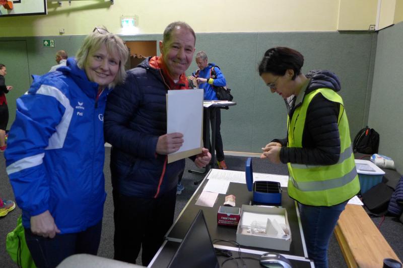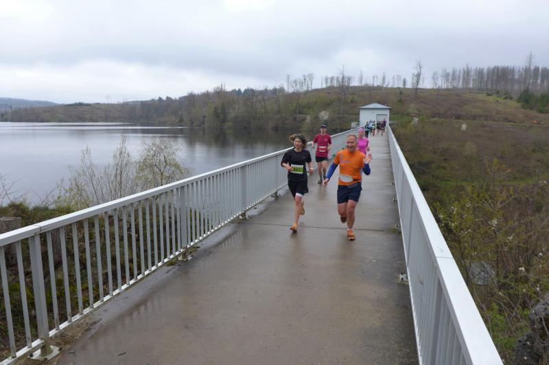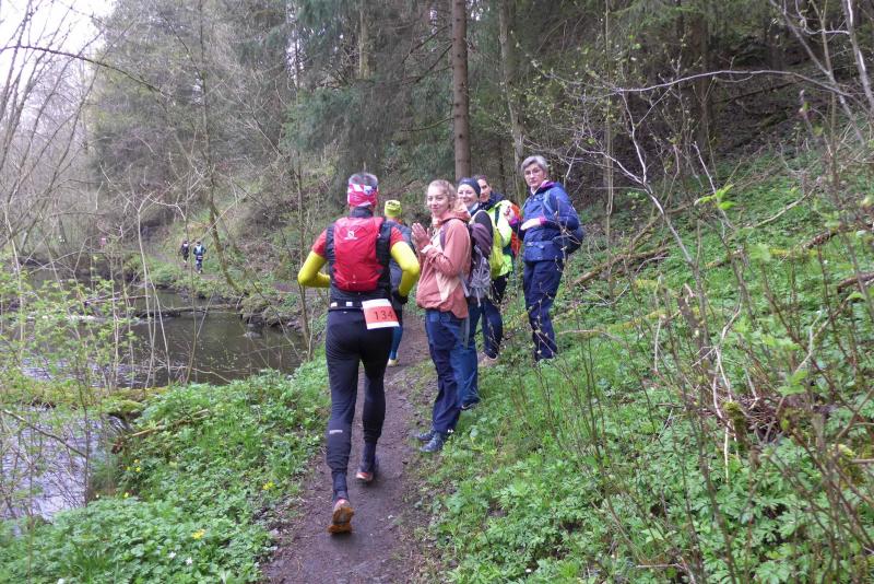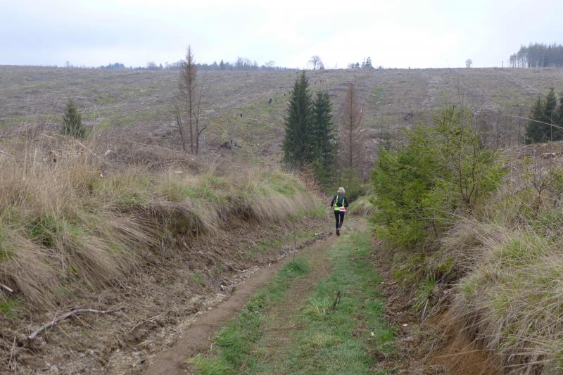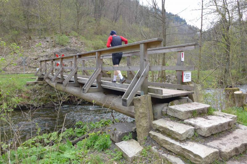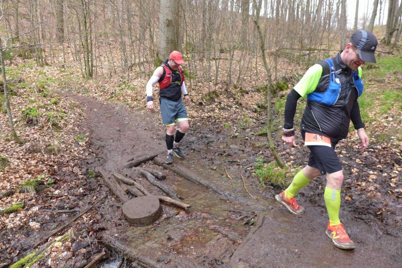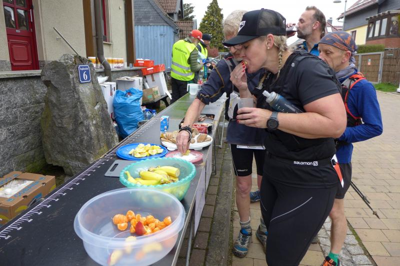 Einen Tag später waren dann die Langstreckenläufer der Gaensefurther Sportbewegung gefordert, denn die 42. Harzquerung stand auf dem Plan. Jens-Uwe Börner hatte für weite 51 Kilometer gemeldet. Petra Becker und Detlef Schäfer standen mit ihm gemeinsam am Start in Wernigerode, waren aber nicht ganz so verrückt und „nur“ auf 25 Kilometer aus. Durch den schlechten Zustand der Wege mussten sich aber alle Teilnehmer auf Umleitungen und damit längere Strecken einstellen. Gleich zu Beginn ging es heftig bergauf und riesige Matschpfützen sorgten für nasse Schuhe. Schlechte Voraussetzungen für eine Langdistanz, begünstigt Feuchtigkeit doch oft eine Blasenbildung. Ein Überholen war schwierig, denn die lange Läuferkette schob sich schleppend die schmalen Steigungen hinauf. Zeit, den Blick schweifen zu lassen, der anstatt auf dichte Wälder oft über weit gerodete Flächen im Horizont verschwand. „Hier war doch vor 6 Jahren noch Wald!“, schüttelte Börner in Erinnerung an seine letzte Harzquerung traurig den Kopf und registrierte stattdessen den Geruch der riesigen Holzstapel frisch geschlagener Bäume am Wegesrand. Aber nicht nur das frustrierte. Auch sein Zeitplan geriet komplett aus den Fugen, denn die Ankunftszeit der Harzbahn, die er sich auf den Unterarm geschrieben hatte, war schon längst verstrichen. Um sie am Kreuzungspunkt fotogarfisch festhalten zu können, hätte er schon fünf Kilometer weiter sein müssen. Der 25-er Kurs mit Becker und Schäfer war bereits abgebogen und in Richtung Ziel unterwegs, als dann auch Sabine Börner ab Benneckenstein die 30 Kilometer lange Wanderstrecke in Angriff nahm. Abenteuerlich führte sie auch durch Bachläufe, Seile halfen an steilen Passagen hinunter oder hinauf und immer wieder galt es Platz zu machen, wenn sich die schnelleren Läufer von hinten laut bemerkbar machten: "Links! Ich komme von rechts!" Auf das Überholen des Gatten wartete sie allerdings vergebens, denn zu allem Unglück verpasste er den richtigen Abzweig. Diesen Irrtum bemerke er erst nach zwei Kilometern, da es keine Markierungen und Streckenposten mehr gab. Bis zum Abzweig nochmal zwei Kilometer zurück und Läufer überholen, die man ja schon mal einkassiert hatte - Börners Laune war verständlicher Weise auf dem Tiefpunkt.