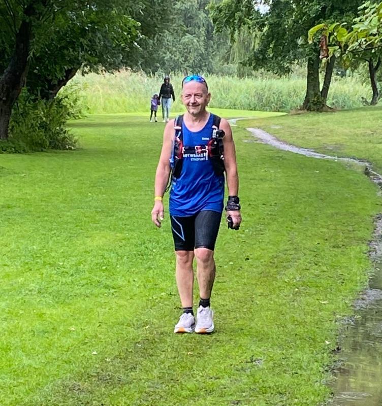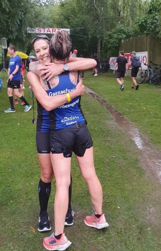 Voller Euphorie mussten nach dem Start erstmal fünf Kilometer Asphalt erlaufen werden. Dabei zog sich das Läuferfeld weit auseinander, wodurch der schmale Weg auf dem Deich bis nach Wassersuppe gut zu laufen war. An der Streckenteilung zwischen den 21- und 25-Kilometerdistanzen dann aufgeregte Diskussionen unter den Bode-Runners, wer mit wem, die lange Strecke oder doch lieber nur den Halbmarathon? Die Entscheidungen waren gefallen und wer den langen Kanten gewählt hatte, den erwartete hinter dem Örtchen Lochow eine kräftezehrende Steigung. Der dichte Wald versprach Erholung, bevor man mit dem Ferchesarer See wieder auf die Streckenführung des Halbmarathons kam. Nicht mehr weit, dann kam die Dranseschlucht, eine beliebte Badestelle vor Ferchesar. Bis dorthin führte auch die Kurzstrecke, um am Wendepunkt dann wieder vier Kilometer zurück zum Zieleinlauf nach Semlin zu laufen. Zu Gast auf der Kurzstrecke auch Lutz Klauß, der seiner alten Truppe in Semlin einen Besuch abstattete und mit Laufkollegin Sylvia Köhn wie in alten Zeiten unterwegs war. Auch für Conny Günther waren es an der Dranseschlucht dann „nur“ noch vier Kilometer. Als Debütantin über die 21,1 Kilometer wusste sie ihren Mann Jürgen und Vereinskollegen Harald Fümel neben sich. Da war es gut, dass keine Zeitnahme erfolgte und sich die Läuferin voll und ganz auf das Abspulen der Kilometer konzentrieren konnte. Hinzu kamen die landschaftlich reizvolle Strecke und die nette Animation an den gut bestückten Verpflegungsständen, die die Teilnehmer immer wieder motivierten. Auf den letzten Kilometern war dann noch einmal höchste Konzentration gefordert, denn der schmale Weg ging auf und ab, der Untergrund wechselte ständig und mitunter hatte der Kurs den Charme eines Orientierungslaufs. Immer wieder regnete es, was das Laufen auf den satten Wiesen schwerer machte. Ob für die einlaufenden Finisher der Langdistanzen der einsetzende Regenguss mit Blitz und Donner nun eher hilfreich oder störend war, wird jeder Teilnehmer für sich eingeordnet haben.