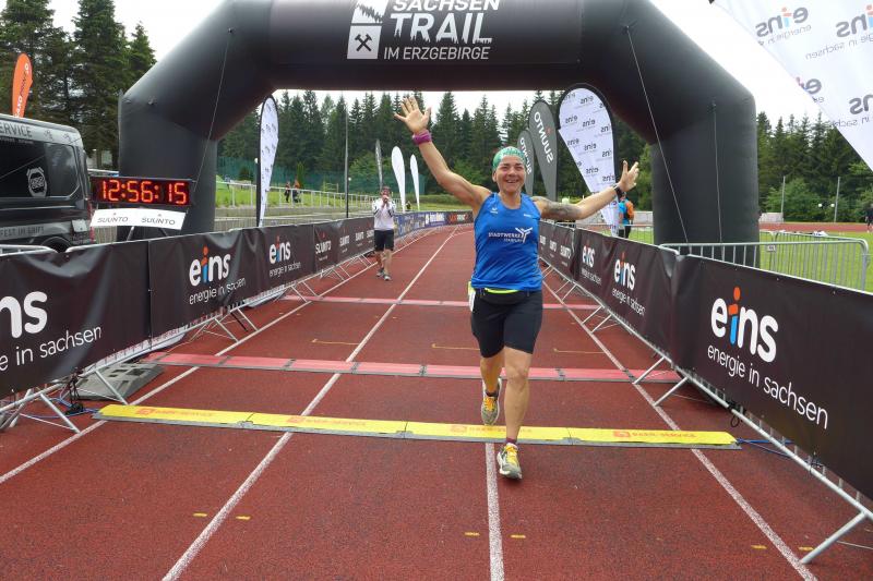 Geringfügig länger waren dagegen die Teilnehmer des Sachsen-Trails im erzgebirgischen Breitenbrunn unterwegs. Ein ganzes Wochenende konnten sich die fünf Bode-Runners der Gaensefurther Sportbewegung dort beim „Trailrunning“ austoben. Dabei waren die angebotenen Strecken mit etlichen Höhenmetern gespickt. Über den Erzgebirgskamm erstreckten sich wundervolle Laufkulissen. Schmale Pfade, steile, langgezogene An- und Abstiege galt es zu erobern. Beim UltraTrail über wahnsinnige 75,5 Kilometer hatte Jens-Uwe Börner ganze 2.120 Höhenmeter vor sich. In 13 Stunden musste die Distanz absolviert sein, so das vorgegebene Zeitlimit des Veranstalters. Vor dem frühen Start um sieben Uhr wurde die Ausrüstung der Ultraläufer kontrolliert, denn die Mitnahme von mindestens einem Liter Getränke, Energieriegel oder Gel war verpflichtend. Sogar ein Trinkbecher und ein Handy mit Landkarte waren mitzuführen. Dazu trainierte Börner im Vorfeld mit einer eng anliegenden Laufweste, die Getränkefächer und ausreichend Stauraum hatte. „Da muss ja auch meine Leselupe mit!“, schlussfolgerte der Ultraläufer, wäre die Bedienung des Handys doch sonst unmöglich gewesen. Der Wahnsinnige war schon lange unterwegs, als auch die Vereinsfreunde über die halbe Ultradistanz, 20 oder 11,5 Kilometer auf ihre Strecken geschickt wurden. Eins hatten alle Trails gemeinsam: den Zieleinlauf! Die letzten 3,5 Kilometer zum Sportpark Rabenberg ging es brachial berghoch. „Lasst den Brustkorb krächzen, bevor ihr keuchend und fluchend durchs Ziel krabbelt!“, feuerte der Moderator die Finisher auf ihren letzten Metern nochmal an: „Bringt die Keulen so richtig zum Glühen!“ Lange wartete man im Ziel auf Börner. Eine dreiviertel Stunde vor Zielschluss lief der Ultraläufer dann auf dem Plateau des Rabenbergs ein. Langsam, humpelnd und schwer atmend aber mit Tränen voller Glück in den Augen. Am letzten Renntag durfte Börner seine Wunden lecken und die Lauffreunde waren wieder gefordert. Da Detlef Schäfer und Olaf Bothe an allen drei Tagen eine Strecke absolvierten, gab es zur Siegerehrung einen ganz besonderen Holzpokal für die beiden Gaensefurther.