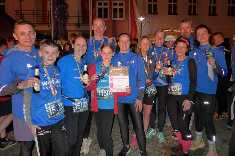 Trotz der Vielzahl an Möglichkeiten, waren alle Veranstaltungen gut besucht. Im Spreewald herrschte sogar an vier Tagen Ausnahmezustand, denn dort waren über 13.000 Aktive als Läufer, Walker, Wanderer, Skater, Paddeler oder Fahrradfahrer unterwegs. Für eine "goldene Gurke" mussten da schon Tagestouren von 200 Kilometer gefahren oder ein Marathon absolviert werden. Erstmalig gab es zum Nachtlauf in Lübbenau eine blaue Gurke nach dem Zieleinlauf. Eindrücke von Läufern mit Lichterketten, Fackeln am Wegesrand und bunt angestrahlten Bäumen und Fassaden werden wohl eine Weile in Erinnerung bleiben. Bis in die Morgenstunden konnte auf dem Marktplatz noch das Tanzbein geschwungen werden. Nicht für die Bode-Runners, die in der Frühe schon wieder für Rad- oder Paddeltouren gemeldet hatten. Wer diesmal im Spreewälder Burg auf nächtliche fünf Kilometer gehen wollte, der hatte erneut ohne Zeitmessung Spaß beim Laufen oder Walken. Der Sonntag stand dann ganz im Focus der Tempomacher. Beim Massenstart über die Zehn-, Halb- und Marathondistanzen sortierten sich am Ende auch noch Walker und Wanderer ein. Der ganze Spreewald war quasi in Bewegung. Nach und nach klatschen sich die einlaufenden Bode-Runners ab, um dann vereint die beiden Gaensefurther über die Königsdisziplin in Empfang zu nehmen. Mario Kreutzmann hatte in Vorbereitung auf den Marathon ja eigentlich von der Schnapszahl 3:33 Stunden geträumt. Doch mit Übergabe seiner Startnummer "340" war sein Ziel schnell fest gemacht: "Unter 3:40 Stunden wäre doch eine gute Marathonzeit!" Und dann war da noch Lina Epperlein, mit der Kreutzmann bis zur halben Distanz gemeinsame Sache machte. Ab da eröffnete sich für die Debütantin komplettes Neuland und sie wagte die Flucht nach vorne. Eine App hielt die Wartenden aktuell und ziemlich bald war klar, dass es nicht nur eine super Zeit werden würde. Die 19-jährige Epperlein lief nach 3:28:45 Stunden als zweite Frau über die Marathondistanz beim 23. Spreewald-Marathon ein. Nicht lange, dann landete auch Kreutzmann mit einer Zielzeit von 3:37:50 Stunden genau in seinem Traumfenster. Freudetränen und Endorphine sprudelten, was seine Blasen an den Füßen gleich ein wenig erträglicher machte. Die Siegerehrung der Marathonläufer auf der großen Festbühne, nahm kein geringerer als Sport-Adi persönlich vor. Ein Moment, der einigen feuchte Augen bereitete und an „Mach mit, mach’s nach, mach’s besser“ Zeiten erinnerte. Seit Jahren begleitet der Jungbrunnen den Spreewaldmarathon: „Grüßt mir die Renate!“, gab er den Bode-Runners mit auf den Weg, der sich an das Sportfest der Grundschulen in der neuen Salzland-Sporthalle noch gut erinnern konnte.