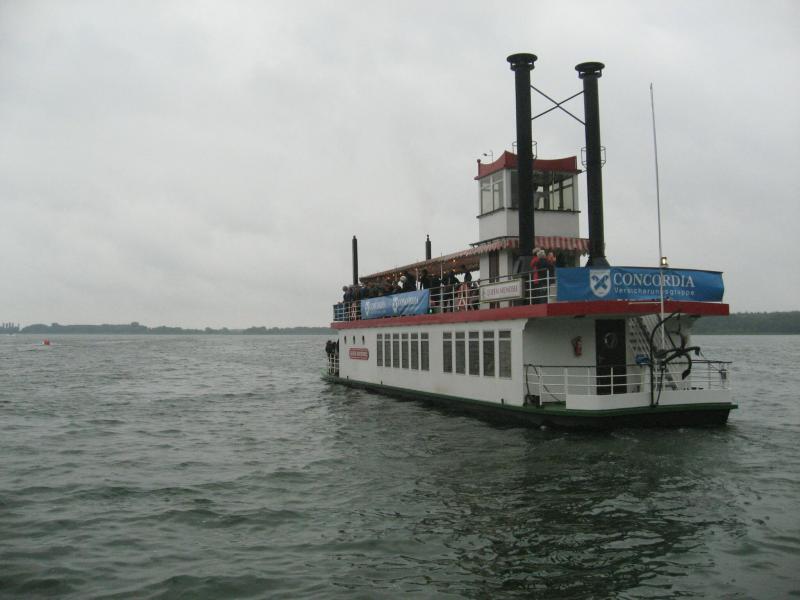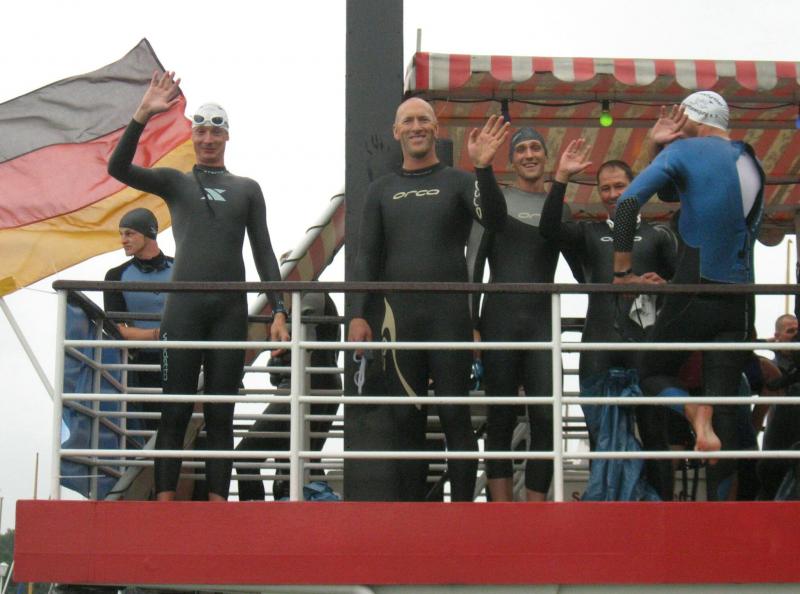 Da kann man wochenweise und kilometerweise trainieren, dieser Blick muss dem Athleten die Dimension einer 1,5 Kilometer langen Schwimmstrecke ganz neu erklären. Vom Ufer aus war der Startpunkt "Queen Arendsee", ein Raddampfer, nur in Umrissen zu erkennen. Vom Raddampfer aus sahen die Teilnehmer das Ufer als einen winzigen Strich zwischen Daumen und Zeigefinger gepresst. Das Wetter hatte plötzlich umgeschlagen, es hat geregnet, der Wind peitschte die Wellen hoch, was für miese Umstände - und was für ein fantastischer Wettbewerb. Torsten Blauwitz sagte am Ende: "Das waren genau meine Bedingungen." Dagegen hat Steffen Schöler bereits auf der Fahrt zum Startpunkt im Neopren gefroren. "Es hätte ruhig ein paar Grad wärmer sein können." Im See musste der 41-Jährige dann seine Brille abnehmen, weil sie mehr Wasser zugelassen als verdrängt hatte. Und doch, und da wusste man bereits um die starken Gaensefurther an diesem Tag, kam er noch vor Blauwitz aus dem See. Das ist nicht gewöhnlich. Torsten Born war zu diesem Zeitpunkt bereits im ersten Wechselgarten. Der Einzige, der Schwimmen als sein favorisiertes Element angibt, trottete diesmal nicht, er sprintete aus dem Nass. Der interne Kampf ging in eine zweite und sehr starke Runde.