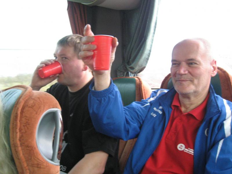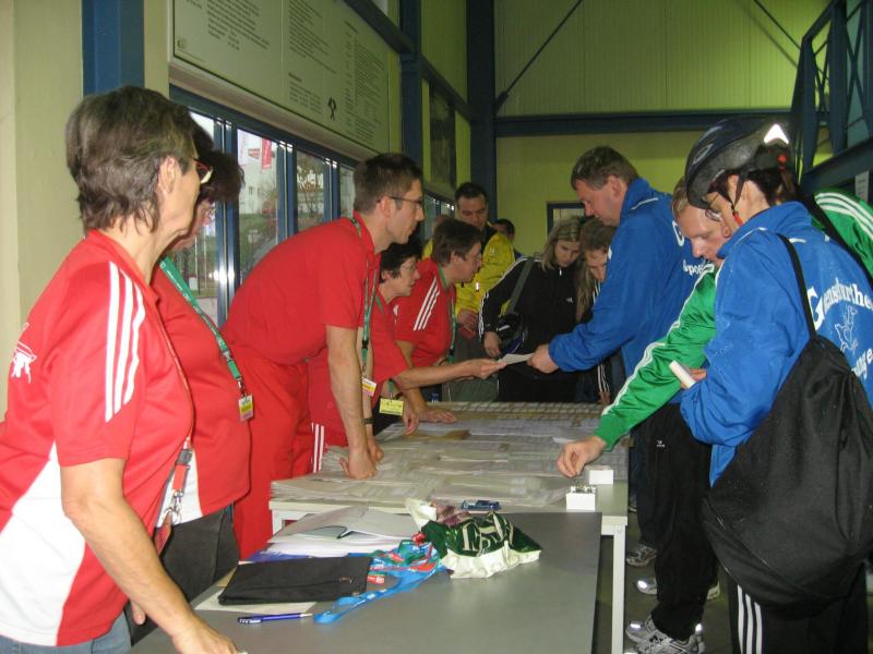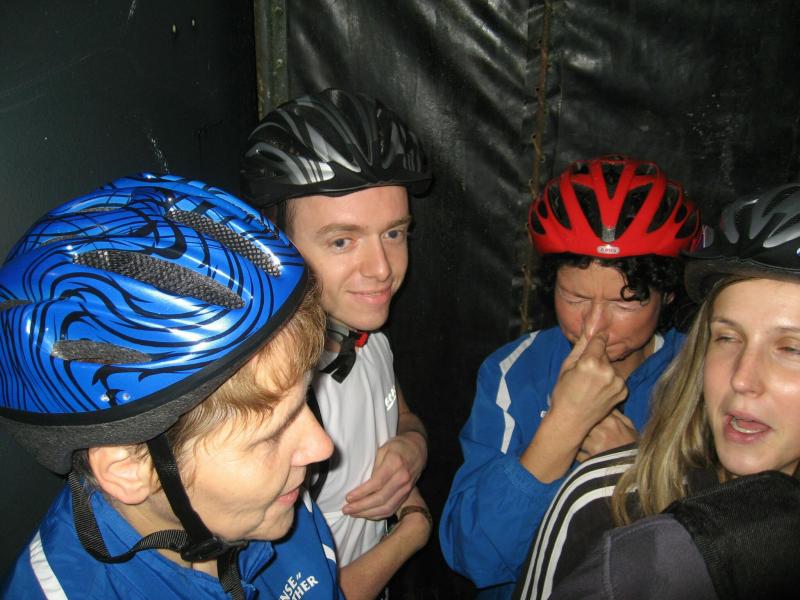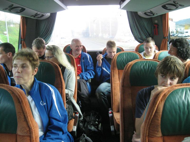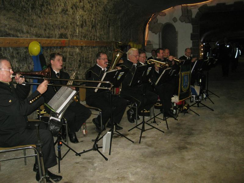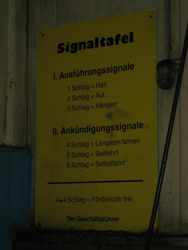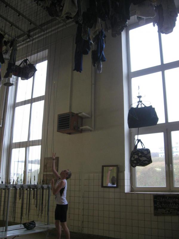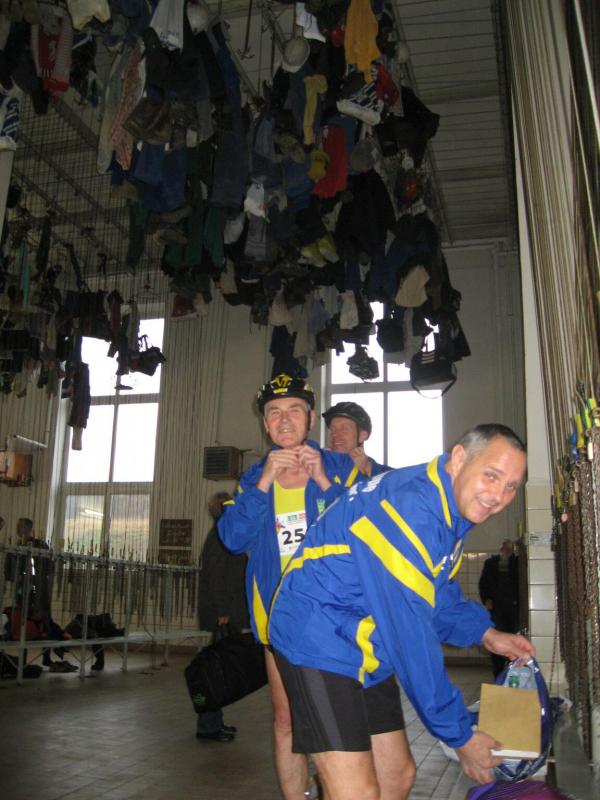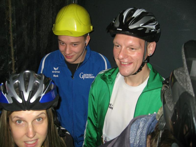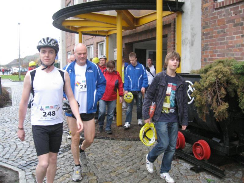 Nur in leichte Laufsachen geschlüpft, hängten die Sportler ihre Kleidung an großen Haken auf. Mit einer langen Kette wurden die Sachen dann unter die Hallendecke gezogen. Wie bei den echten Bergleuten auch, ist die Kleidung nur dort vor Verschmutzung geschützt. Weiterhin ausgerüstet mit Helm und Grubenlampe, eilten die Läufer durch das feuchtkalte Herbstwetter zum Brügman-Schacht. Der Förderkorb ließ nicht lange auf sich warten und schon bald wirbelte die 30 Grad warme Abluft vorbei. Nach drei Minuten Abwärtsfahrt bis auf 680 m Tiefe, eröffnete sich den Teilnehmern ein Erlebnisbergwerk der Superlative. Die musikalische Begrüßung durch die Bergmannskapelle nahmen die noch tauben Ohren nur gedämpft wahr. Aber den Sportlern und gut 150 Zuschauern blieb noch genug Zeit zur Akklimatisierung.