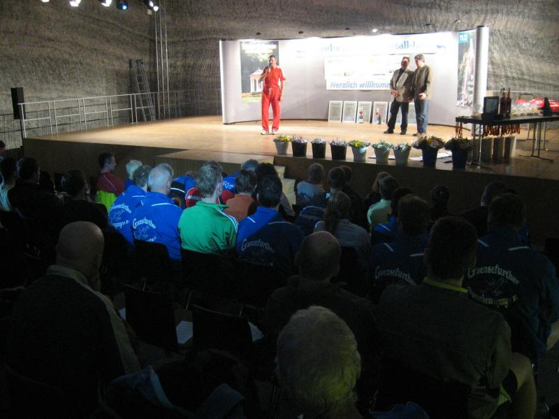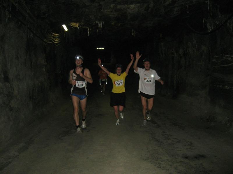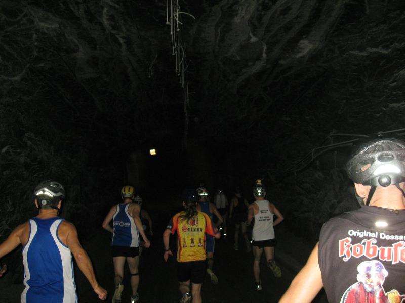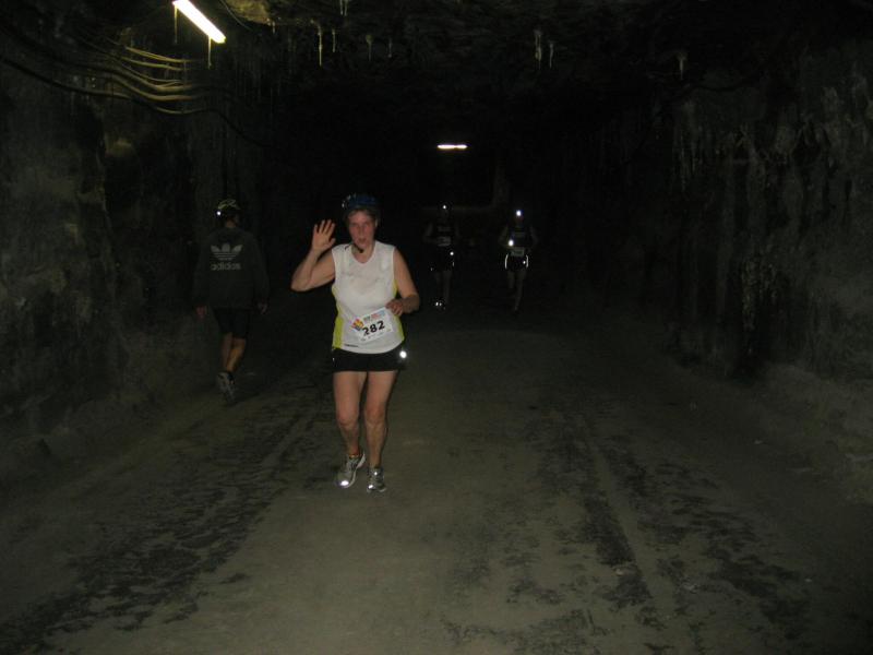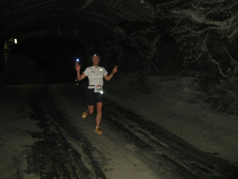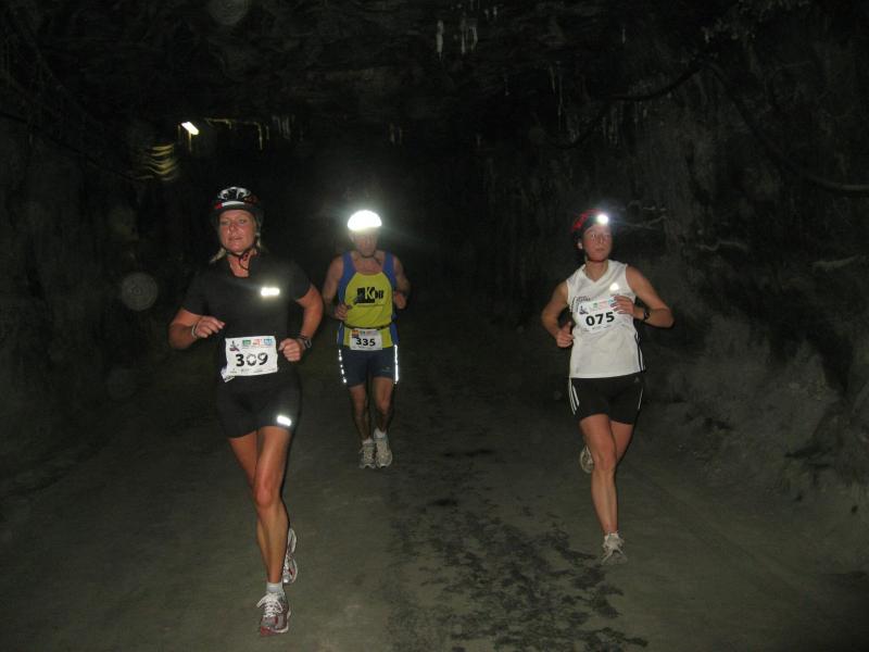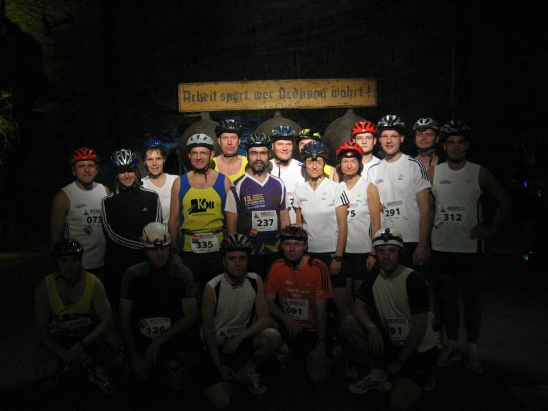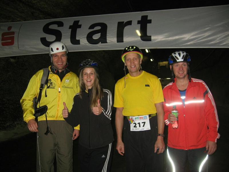 Um 11.00 Uhr waren dann alle 479 Starter bereit für das große Abenteuer. Eine gemessene Luftfeuchtigkeit von 23,5 Prozent, was einem Lauf in der Wüste entspricht, Temperaturen zwischen 28 bis 37 Grad Celsius, extrem glatte Salz-Passagen und die Steigung der sogenannten „Mauer“ mit 24 Prozent, sollte einem harten Bergmann-Arbeitstag entsprechen können. Verhalten gingen die Bode-Runners an die erste Fünf-Kilometer-Runde. In den spärlich beleuchteten Gängen hallte es: „Anja? Ja! Lutz? Ja! Dirk? Ja! Mike? Ja! Dann kam die Mauer: Kleine Schritte, die Arme schwangen kontrolliert mit, gleichmäßig tiefe Atemzüge, der Puls schlug bis unter den Helm, im Lichtkegel rieselte der Salzstaub. Nach gut zwei Kilometern Steigung: „Anja?“ Mehr bekam Sabine nicht raus. Keine Antwort. An der Trinkstelle schluckten die Läufer dankbar das gereichte Wasser. Einen Becher noch über den Kopf, irgendwie schmeckte jetzt alles salzig. Auf dem langgezogenen Plateau kamen die Läufer wieder zu Luft. Die letzten zwei Kilometer der ersten Runde ging es bergab. Nur mit Lampe und gutem Laufschuh war ein rasantes Tempo möglich. Wer im Dunkeln tappte oder ängstlich auf die glänzenden Salzstellen reagierte, schaltete lieber einen Gang runter. Vorbei an der riesigen Frischluftanlage, stieg den Läufern die Würstchenluft aus der unterirdischen Gastronomie in die Nase. Nun war es nicht mehr weit und 150 Zuschauer puschten die tropfenden Läufer in die zweite Runde. Bevor es wieder an die Mauer ging, verlangte der Körper noch einmal Wasser. Während manche gleich in den schnellen Schritt wechselten, hatten andere nur ein Ziel: Nicht stehen bleiben! Langsam aber beständig ging es wieder nach oben. Hitzestau, der Kopf und die Beine drohten zu platzen, Helm und Lampe nervten nur noch, man hatte das Gefühl die Decke fällt einem auf den Kopf. Gänsehaut pur, als die Kuppe endlich erreicht war. Ja!!! Los, nach Hause!