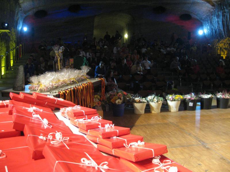 Sofort nach dem Zieleinlauf wurde jeder Läufer am mitgeführten Chip gescannt. Noch vor dem Becher Wasser hatte man also die Auswertung in der Hand. Florian Börner vom cash´n fun Junior Team der Salzlandsparkasse jubelt als einziger Bode-Runner. Zu groß war die Konkurrenz in den einzelnen Altersklassen. Aber für jeden Finisher stand ein Salzkristallpokal bereit, ein Erinnerungsstück an ein hartes Stück Arbeit! Nach dem gemeinsamen Versuch am Bergmannslied, feierte die Masse ihre Sieger im imposanten Festsaal.