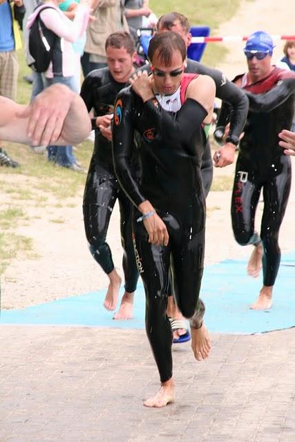 Und so entstiegen die Athleten mit mehr oder auch weniger Berührungen zum Nebenmann/Nebenfrau das Wasser und auf ging es zum ca. 20 m höher gelegenen Wechselgarten.