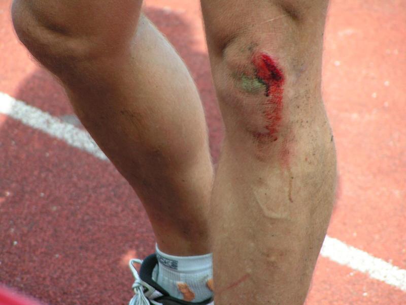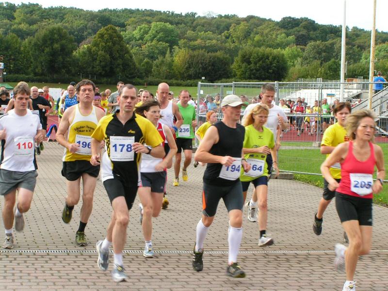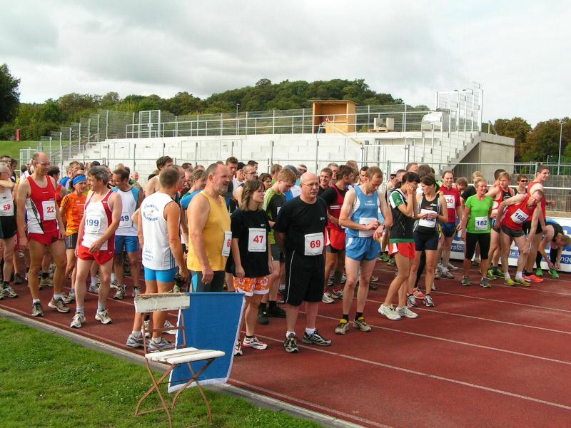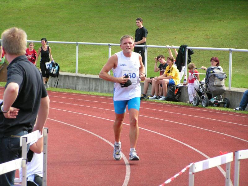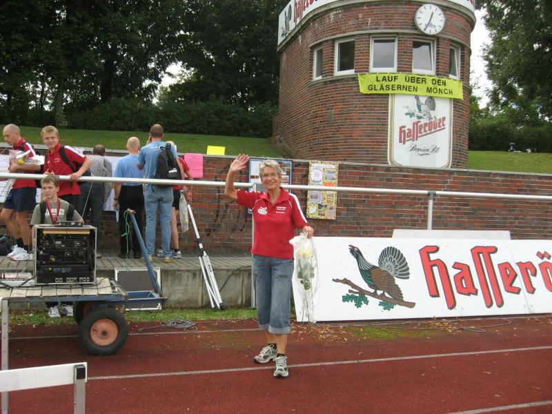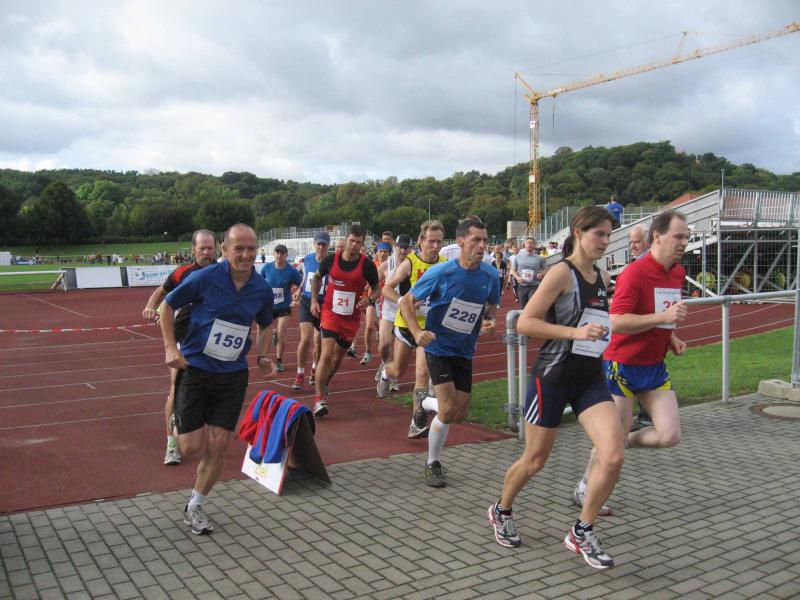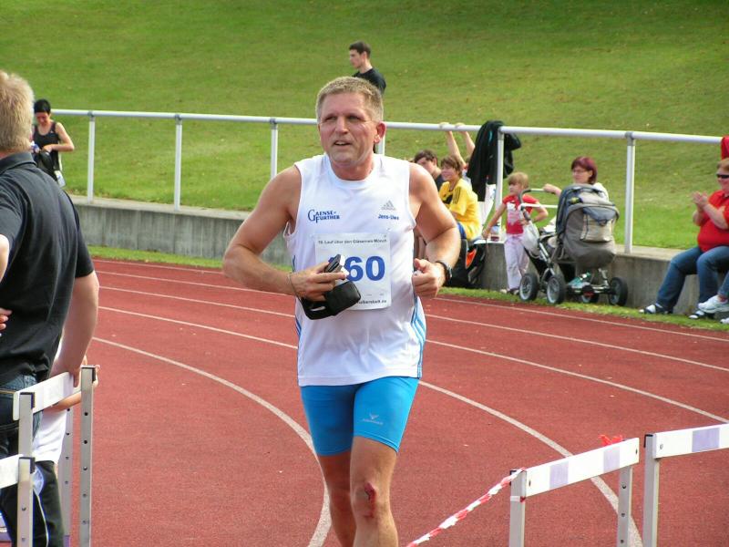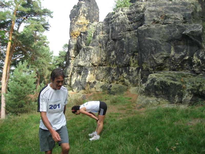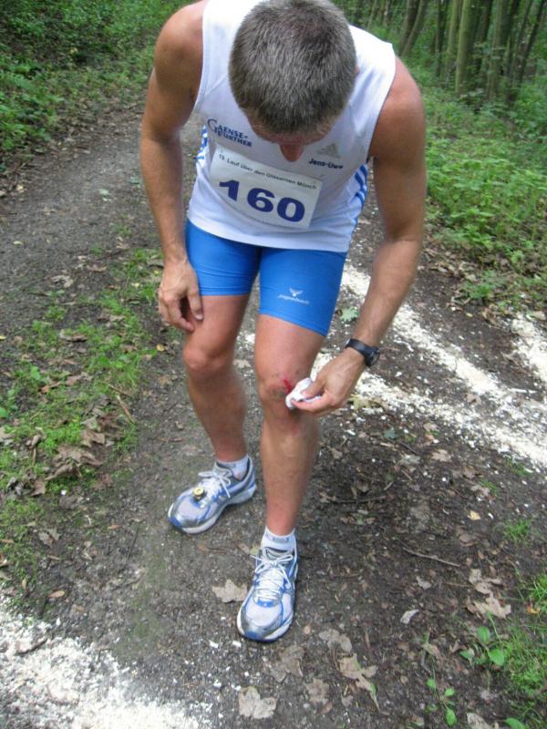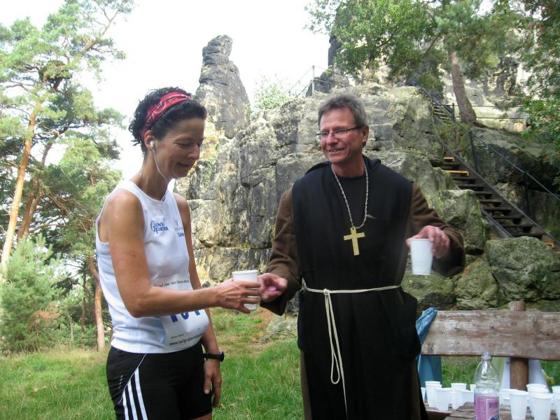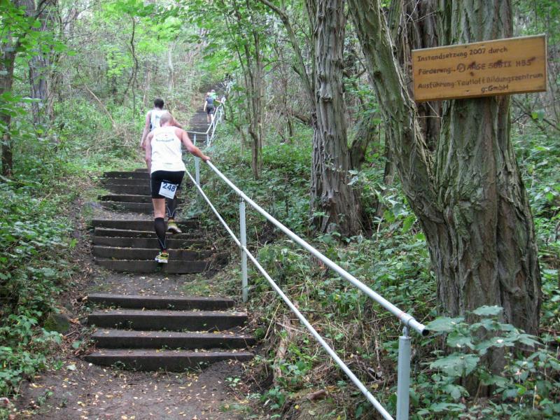 Spätestens mit dem Startschuss über 13 Kilometer waren die Gedanken an den bevorstehenden Muskelkater verschwunden und langsam reihte man sich im Tross der Laufverrückten ein. Die ersten sechs Kilometer verliefen in leichten Wellen, bevor die berüchtigte Treppe hinauf zum Gläsernen Mönch den Lauf abrupt stoppte. Quasi im Gänsemarsch zog sich die Menschenkette pustend die 230 Stufen hinauf, bis ein Mann im Mönchsgewand mit kühlem Nass und Bibel das Ende der Qual erahnen ließ. „Bitte lieber Gott, heile mich von dieser Laufkrankheit!“, konnte man vielen Gesichtern scheinbar entnehmen. Aber weit ab vom Start ging der Weg nur weiter und das zum Glück dann auch bald wieder bergab. Unaufmerksam und wie immer der Fotografie verfallen, stürzte Jens-Uwe Börner über eine Wurzel und konnte nun eine Wunde am Knie sein eigen nennen. Zu diesem Zeitpunkt gab er dann auch Schmidtschneiders Verfolgung auf, widmete sich ganz seinem Hobby und hakte den Lauf als gute Trainingsvorbereitung für den Magdeburg-Marathon ab.