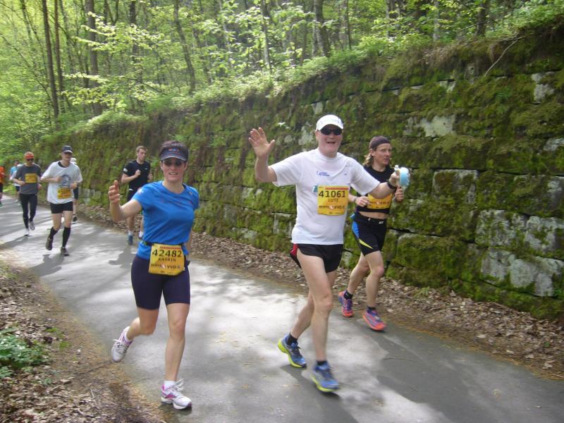 Die S-Bahn brachte die drei Marathonis und ihre Begleiter in das 42,2 Kilometer entfernte Königstein, inmitten der Sächsischen Schweiz. Nachdenkliche Blicke aus dem ewig fahrenden Zug ließen verkünden: „Das müssen wir dann alles zurücklaufen!“ Katrin Winkler-Hindricks hatte Ehemann Josef zum Fahrradfahren überreden können. An vorher abgesprochenen Treffpunkten wollte Josef nach dem rechten schauen. Die Gefährtinnen von Lutz Klauß und Dirk Meier nutzen den Service des Veranstalters und begleiteten das Marathonfeld mit einem historischen Schaufelraddampfer auf der Elbe. Der Elberadweg schlängelte sich am Elbsandsteingebirge entlang, mit ihm 990 Teilnehmer auf der Langdistanz. Eine malerische Landschaft die irgendwann zweitrangig wurde, denn auf den weiten Elbwiesen brachte nicht einmal der Rückenwind die ersehnte Abkühlung. Alle Getränkestände wurden angelaufen, Helfer verteilten Becherduschen auf die erhitzten Köpfe und erste Sirenen der Rettungswagen ließen nichts Gutes erahnen. Hindricks beschwor ihren Mann: „Mach schnell noch mal ein Foto, das wird das letzte sein, auf dem ich noch zu erkennen bin!“ Die wartenden Bode-Runners im Stadion machten sich Mut: „Alle drei sind erfahrene Marathonläufer, die stellen sich auf die heißen Temperaturen ein!“ Von daher hatte auch keiner bereits mit Dirk Meier gerechnet. Über Handy verkündete Börner: „Dirk kommt, Dirk ist da!“ Mit nur vier Minuten über seine Zielzeit zeigte Meier der Gluthitze die kalte Schulter. Als 37. von insgesamt 157 Frauen, folgte Hindricks rundum zufrieden und verkündete: „Der Lutz kommt gleich, ist dicht hinter mir!“ Die Schokolade hatte geholfen, denn auch Lutz Klauß hatte es geschafft. Das war ein hartes Stück Lauf!