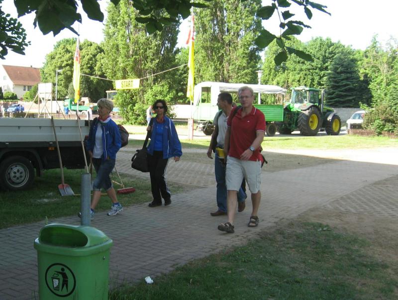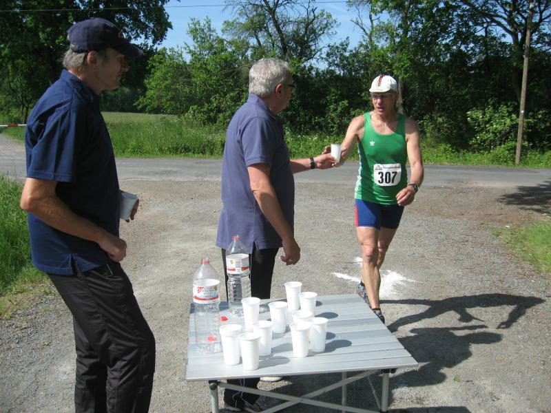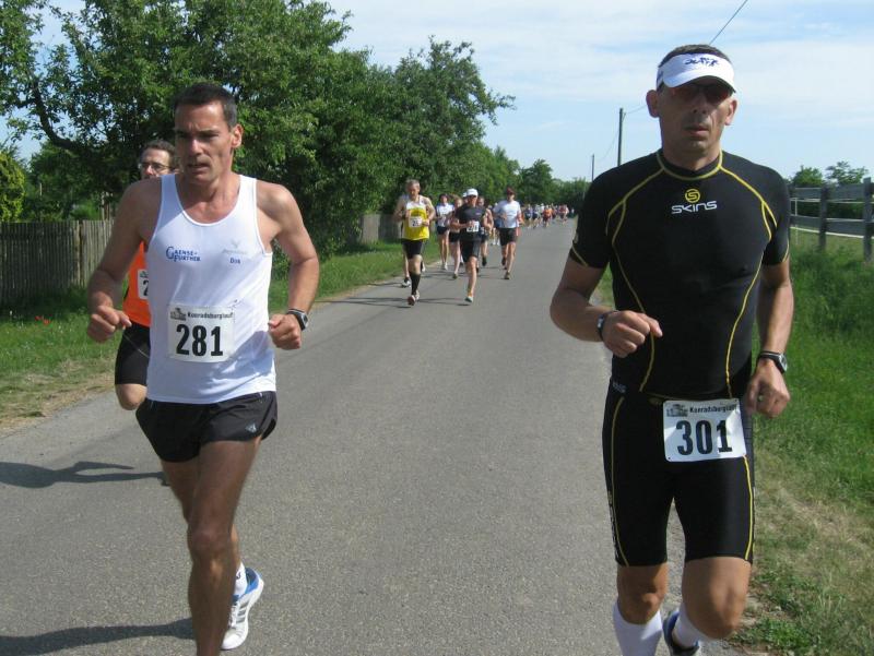 Als anspruchsvoll und für „Fortgeschrittene“ deklariert, sollte die Strecke ihrer Beschreibung durchaus gerecht werden. Bereits nach dem ersten Kilometer stieg die Asphaltstraße merklich an. Doch gerade als das Atmen zu anstrengend werden sollte, sorgte ein schattiger Waldweg wieder für Entspannung. Das Spiel zwischen Licht und Schatten erforderte die ganze Aufmerksamkeit der Läufer. Hatten die Veranstalter den quer liegenden Baum als Extra-Bonbon auf dem Weg drapiert? Wie bei der „stillen Post“ wurde vom Vordermann lauthals an den Verfolger weitergegeben: „Baum!“ Gehüpft, gegrätscht oder draufgetreten, die Barriere sollte für die Läufer kein Hindernis sein. Aus dem Wäldchen führte die Strecke hinaus auf die Felder. Bis zur Streckenteilung brannte die Sonne zusätzlich auf die erhitzten Köpfe. Streckenposten teilten nun die ankommenden Läufer auf: „Die Sieben Kilometer nach links, elf Kilometer nach rechts!“ „Machs gut, arme Bine“, verabschiedete sich Petra Becker von ihrer Vereinskollegin. Zusammen mit Heidi Schwenke vom BSV Eickendorf flitzte Becker nun in Richtung Konradsburg. Die Wahl der kürzeren Streckenlänge sollte sich am Ende gelohnt haben, denn beide Läuferinnen konnten in ihren Altersklassen auf das Siegertreppchen steigen.