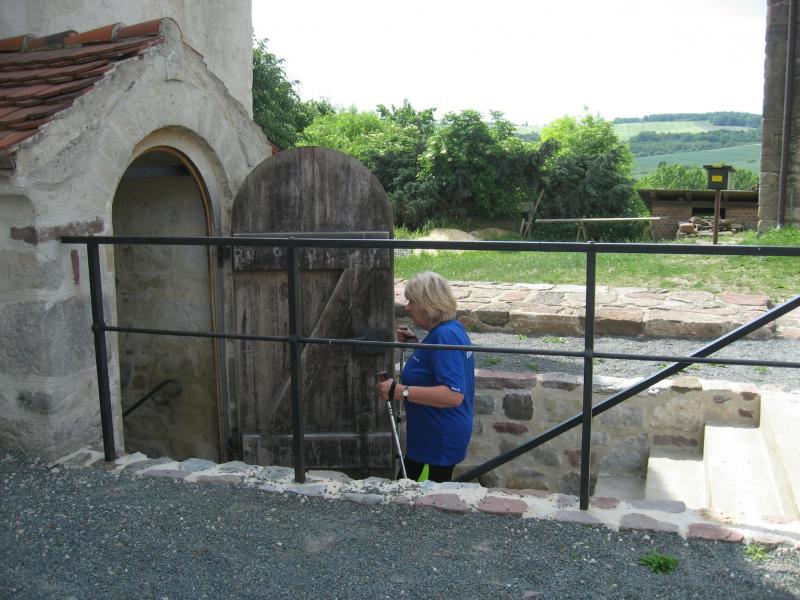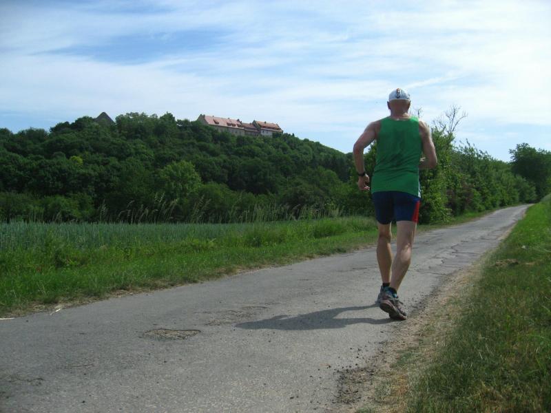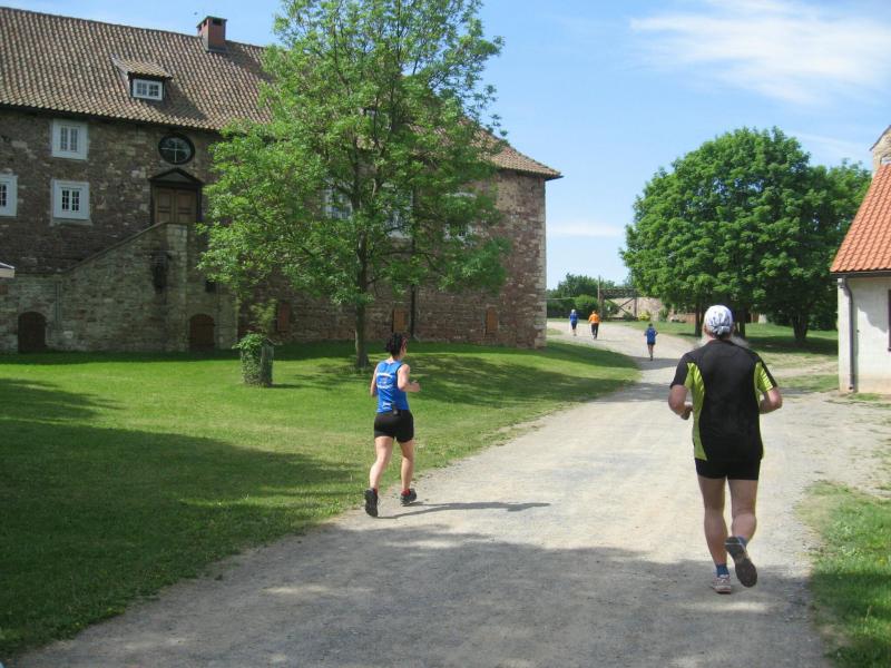 Jens-Uwe Börner, mit den 11-Kilometer-Läufern unterwegs, erspähte mit seinem Fotoapparat am Horizont den Brocken. Spätestens hier kam wohl der Entschluss mehr auf die Bildmotive als auf die Laufzeit zu achten. Die Läufer erreichten über den Friedrichshohenberg den höchsten Punkt der Strecke und bogen nun ebenfalls in Richtung Konradsburg ab. Während sich einige Walker und natürlich auch Herr Börner Zeit für eine kurze Besichtigung nahmen, eilten die Läufer durch den kleinen Burggarten wieder hinab nach Ermsleben.