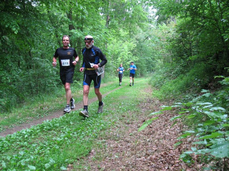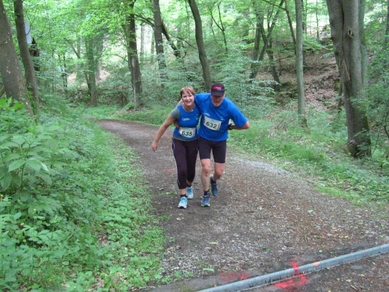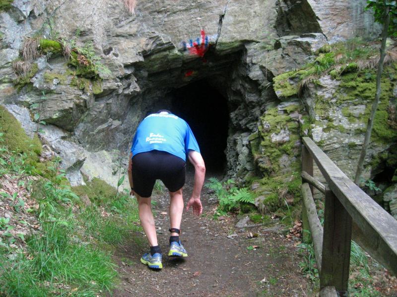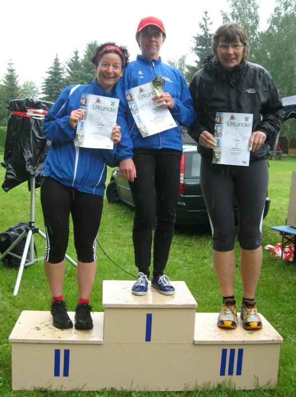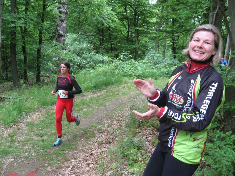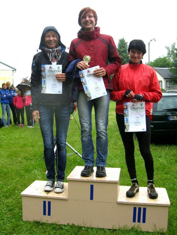 Nach verschlungenen Waldwegen passierten die 16-Kilometer-Läufer die sagenumwobene Mägdetrappe und es ging rasant bergab in Richtung Mägdesprung. Bei Sabine Börner sorgte das lose Felsgestein für einen unfreiwilligen Stopp. Zum Glück waren alle Glieder ordentlich warmgelaufen und der Abstieg konnte fortgesetzt werden. In Mägdesprung angekommen, ging es wieder 120 Höhenmeter hinauf. Geteiltes Leid ist halbes Leid dachte sich das Trio Sylvia Köhn, Lutz Klauß und Jens-Uwe Börner. Gemeinsam spornten sie sich an, machten sich Mut und kamen bald darauf über einen schmalen Klippenweg am sogenannten „Pioniertunnel“ an. Die Durchquerung des 15 Meter langen Felsdurchbruchs war nur in gebückter Haltung möglich, ein Fotomotiv wie für Börner gemacht! Am Verpflegungsstand konnten sich die Läufer noch einmal stärken, denn nun kam der Anstieg zum Birkenhäuschen. Hinab ins Steintälchen ging es wieder hinauf zum Himmelsgarten bevor die Strecke auf den letzten drei Kilometern herrlich sanft auslief. Im Zielbereich herzlich vom Publikum und Moderator empfangen, kümmerte sich ein Sportfreund „Peter“ rührend um alle einlaufenden Damenbeine. Er ließ es sich nicht nehmen, den Transponder für die Zeitmessung höchstpersönlich zu entfernen. Bis zum Zielschluss hatte sich der Regen zurückgehalten, bei der Siegerehrung schüttete es dann aber ordentlich. Aus dem schützenden Zelt, hinauf aufs Treppchen, durften wieder nur die Bode-Runner-Damen. Ina Schöler von der ZLG Atzendorf wurde ziemlich nass, denn nicht nur die Gesamtzweite bei den Damen, sondern auch der Sieg in ihrer Altersklasse verlangte nach ihrem Erscheinen. Isa Höber siegte souverän in der W 45 und Sylvia Köhn und Sabine Börner freuten sich über einen zweiten Platz in den Altersklassen W 30 und W 45.