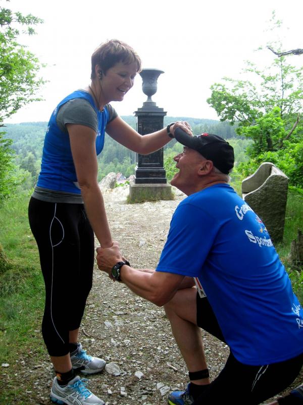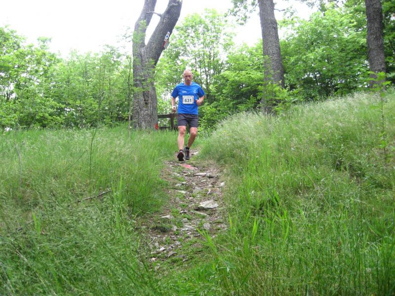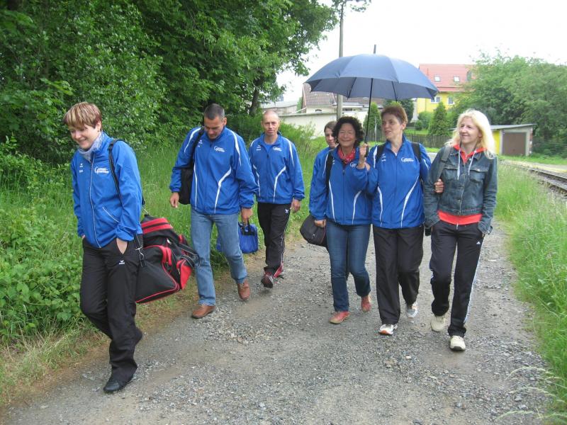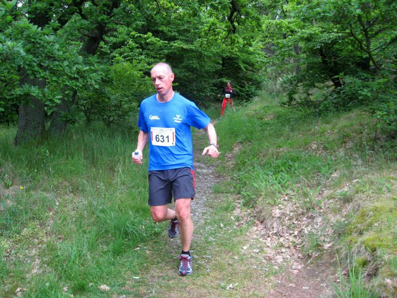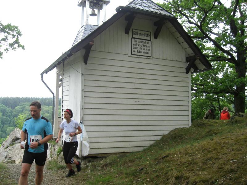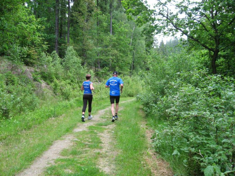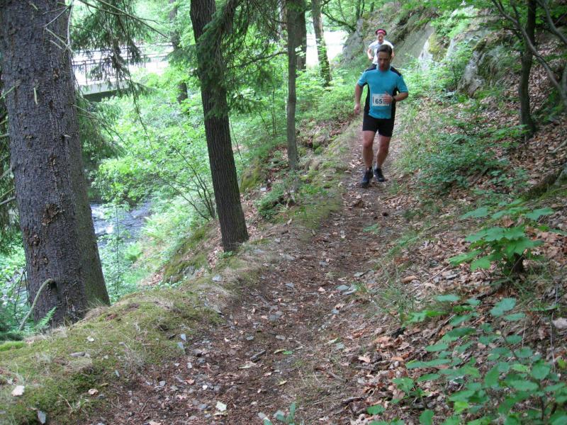 Nach verschlungenen Waldwegen passierten die 16-Kilometer-Läufer die sagenumwobene Mägdetrappe und es ging rasant bergab in Richtung Mägdesprung. Bei Sabine Börner sorgte das lose Felsgestein für einen unfreiwilligen Stopp. Zum Glück waren alle Glieder ordentlich warmgelaufen und der Abstieg konnte fortgesetzt werden. In Mägdesprung angekommen, ging es wieder 120 Höhenmeter hinauf. Geteiltes Leid ist halbes Leid dachte sich das Trio Sylvia Köhn, Lutz Klauß und Jens-Uwe Börner. Gemeinsam spornten sie sich an, machten sich Mut und kamen bald darauf über einen schmalen Klippenweg am sogenannten „Pioniertunnel“ an. Die Durchquerung des 15 Meter langen Felsdurchbruchs war nur in gebückter Haltung möglich, ein Fotomotiv wie für Börner gemacht! Am Verpflegungsstand konnten sich die Läufer noch einmal stärken, denn nun kam der Anstieg zum Birkenhäuschen. Hinab ins Steintälchen ging es wieder hinauf zum Himmelsgarten bevor die Strecke auf den letzten drei Kilometern herrlich sanft auslief. Im Zielbereich herzlich vom Publikum und Moderator empfangen, kümmerte sich ein Sportfreund „Peter“ rührend um alle einlaufenden Damenbeine. Er ließ es sich nicht nehmen, den Transponder für die Zeitmessung höchstpersönlich zu entfernen. Bis zum Zielschluss hatte sich der Regen zurückgehalten, bei der Siegerehrung schüttete es dann aber ordentlich. Aus dem schützenden Zelt, hinauf aufs Treppchen, durften wieder nur die Bode-Runner-Damen. Ina Schöler von der ZLG Atzendorf wurde ziemlich nass, denn nicht nur die Gesamtzweite bei den Damen, sondern auch der Sieg in ihrer Altersklasse verlangte nach ihrem Erscheinen. Isa Höber siegte souverän in der W 45 und Sylvia Köhn und Sabine Börner freuten sich über einen zweiten Platz in den Altersklassen W 30 und W 45.