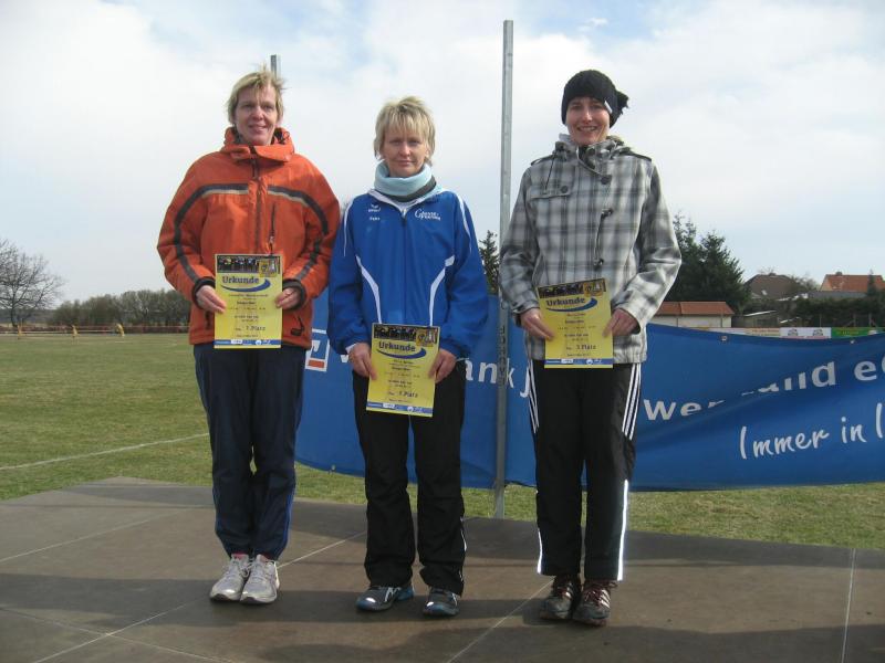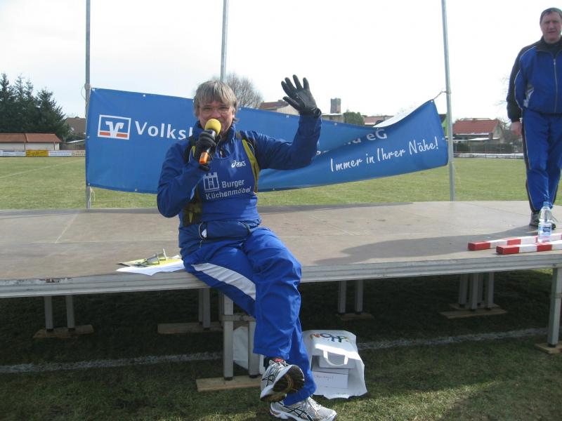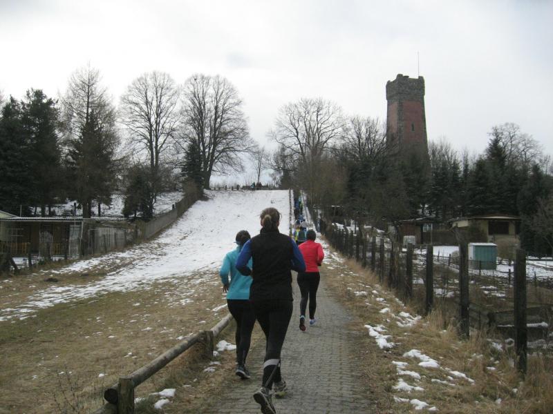 Endlich erlöste der Startschuss über die 10,3 Kilometer alle Frierenden. Dirk Meier, Jens-Uwe Börner und Sylvia Köhn schlugen sofort ein schnelles Tempo an. Lutz Klauß benötigte gut einen Kilometer um wieder an Köhn heran zu laufen. Da wo im Burger Volksmund das „Ende der Welt“ beschrieben wird, führte der Lauf weiter durch das dicht bewaldete Bürgerholz. Die zum Teil stark vereiste Strecke verlangte die volle Konzentration der Läufer. Schritt für Schritt nahm sich Petra Becker einen Läufer nach dem anderen vor. Eine Strategie, welche sich am Ende bezahlt machen sollte. Claudia Meier war locker mit Renate Liedtke unterwegs, hatte sie sich doch kurz vor der Anmeldung noch für die zehn Kilometerstrecke um entschieden. Was wäre ein Bismarckturmlauf ohne Bismarckturm? Leider liegt dieser auf einem Hügel. „Nee! Da muss ich jetzt nicht hoch, oder?“ Abrupt stoppt Becker ihren Lauf und schaut entsetzt auf die lange Treppenanlage. Amüsiert klatschten die Zuschauer in die Hände: „Doch, doch, da geht`s hoch!“ Mit der netten Anfeuerung wurde auch diese Herausforderung gemeistert. 1907 von den Bürgern der Stadt zu Ehren des Reichskanzlers Otto von Bismarck errichtet, hatten die Vorbeieilenden nur wenig Blicke für den Turm in der „Stadt der Türme“. Der letzte Kilometer zum Ziel ging nun leicht bergab und der Wind schob ausnahmsweise mal von hinten. Mit dem Stadioneinlauf waren die zehn Kilometer geschafft. Eine Ehrenrunde für die Zuschauer musste aber noch sein und wieder mal Wind von vorn. Mann, bin ich heute gut drauf, wundert sich Börner, dass Meier noch gar nicht an ihm vorbei gezogen war. Der Vereinskollege stand jedoch bereits mit dicker Jacke und warmem Tee im Ziel. Tunnelblick lässt grüßen, das war Börner unterwegs wohl entgangen. Klauß folgte schnell, erntete aber nur einen undankbaren vierten Platz in seiner Altersklasse. Köhn und Becker retteten ihre Plätze bis in das Ziel. Und auch Liedtke stieg am Ende wieder auf das Siegertreppchen.