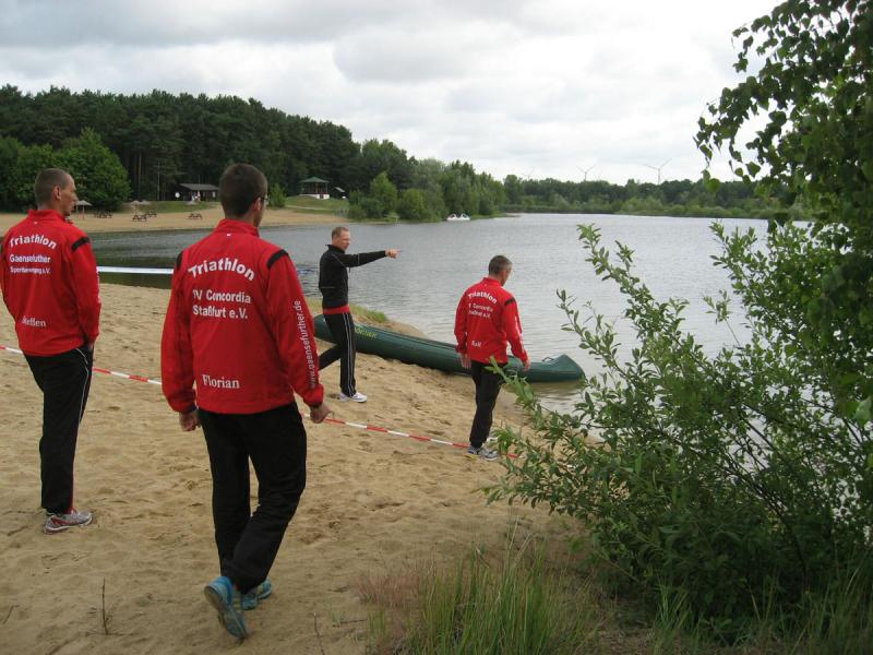 In der Nähe von Stendal, am idyllisch gelegenen Waldbad Wischer, starteten am Wochenende knapp 90 Teilnehmer über die ausgeschriebene olympische Distanz des SV Wasserfreunde Stendal 1923. Unter ihnen auch sechs Mutige der Gaensefurther Sportbewegung. Routiniert liefen die Vorbereitungen ab. Nachdem das Fahrrad mit Helm, Schuhe und Startnummerngürtel neben der Wasserschüssel für die Dreckfüße ihren Platz im Wechselgarten gefunden hatten, erfolgte im 21 Grad warmen Baggersee der Startschuss für die 1,5 Kilometer lange Schwimmstrecke. Im Kampf um die Positionen geriet der stille See mächtig in Wallung, bis sich die einzelnen Schwimmer wie an einer langen Kette eingereiht hatten. Da zwei Seerunden zu absolvieren waren, mussten die letzten fast bangen, von den ersten eingeholt zu werden. Jens-Uwe Börner, einfach nicht als Schwimmer geboren, hatte noch 750 Meter vor sich, als nach gut 22 Minuten der allererste Schwimmer aus dem Wasser hechtete. Starke 27:49 Minuten und damit schnellster Gaensefurther war Ralf Rosenmeier, gefolgt von Steffen Schöler, Torsten Blauwitz und Florian Börner. Die genannten dürften bereits auf der Fahrradstrecke gewesen sein, als auch Ingo Bieganski endlich das nasse Element hinter sich bringen konnte. Und nach knapp 45 Minuten hatte es sogar Jens-Uwe Börner geschafft. Bis zum wartenden Fahrrad mussten ungefähr 100 Meter im weichen Sandstrand zurückgelegt werden, was zusätzlich an den Kräften zehrte. Abkühlung verschaffte dann zunächst der Fahrtwind auf der durchnässten Kluft. Aber die hügelig zu fahrende 43,5 Kilometer lange Radstrecke heizte den Sportlern schnell wieder ein. Während die Ausreißer ziemlich dicht zusammen um jede bessere Position kämpften, versuchten Bieganski und Börner von hinten Plätze gut zu machen. Auch Börner gelang dies, trotz schwerem Stahlrad. Mit den Rädern wieder im Wechselgarten angekommen, sollte wie schon so oft die Laufstrecke die Entscheidungen bringen. In der Gaensefurther Spitze hatte sich Blauwitz kämpferisch nach vorn gearbeitet. Sollte es anfangs garnicht laufen, siegte er am Ende knapp vor Schöler. Prima in Form erwies sich auch Rosenmeier, der nur auf der Laufstrecke letztlich einbrach, den Vorsprung jedoch knapp vor Börner Junior halten konnte. Beide kamen in ihren Altersklassen auf das Podest. Dann folgte Bieganski, welcher durch seine 43-er Laufzeit noch so manchen Sportler überholt hatte. Inzwischen erfolgte bereits der Aufruf, den Wechselgarten für den Jedermann-Triathlon zu räumen. Zu diesem Zeitpunkt kam auch Jens-Uwe Börner endlich ins Ziel. Drei Stunden Fitness lagen hinter ihm. Eine Cola später stellte sich auch bei ihm der zufriedene Gesichtsausdruck ein. Bereits über den gesamten Tag herrschte Anspannung pur bei Jana Bieganski. Denn nun war es endlich soweit, der Start beim Jedermann-Triathlon über 750 Meter Schwimmen, 14,5 Kilometer Fahrrad fahren und fünf Kilometer laufen. Mit ihr stand zum ersten Mal Jana Berger am See, welche ganz relaxt ihr Triathlon Debüt angehen wollte. Beide gaben ihr bestes und bei Bieganski reichte es sogar für den dritten Platz in ihrer Altersklasse. Nach Siegerehrung und Tombola ging ein langer und aufregender Wettkampftag zu Ende. Beste Vorbereitungsarbeit auf den 11. Gaensefurther-Schlossbrunnen-Triathlon!