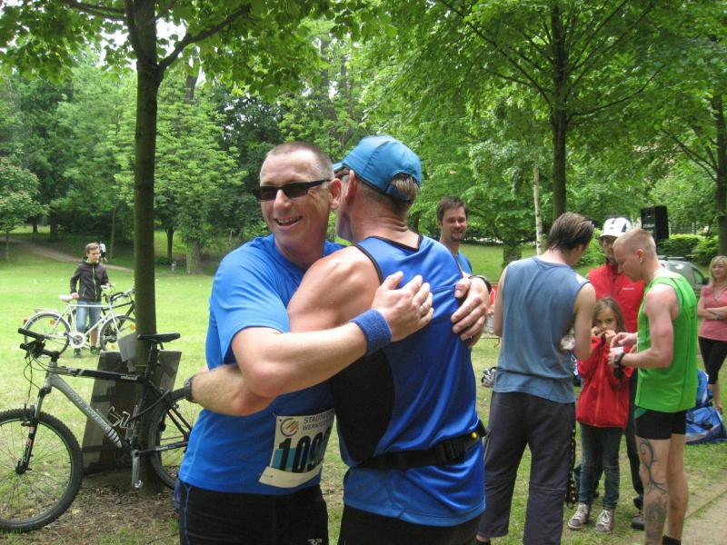 Verpasst! Gerade als sich Vater und Opa dem obligatorischen Gruppenfoto stellten, wurde der jüngste Spross der Familie Eisfeld, Jan, auf den Schnupperkurs über 1,1 Kilometer geschickt. Vater Jörg hatte Mühe den quirligen Haufen einzuholen. Erst als es doch ganz schön bergan ging, konnte er den Sohnemann ausmachen und ihn das restliche Stück hinein ins Ziel begleiten. Ein Erlebnis, was die beiden in Zukunft vielleicht öfter gemeinsam teilen. Jan hatte sich gut im Mittelfeld gehalten, musste im Ziel jedoch getröstet werden, hätte er doch wahnsinnig gern für Vater und Opa gewonnen.