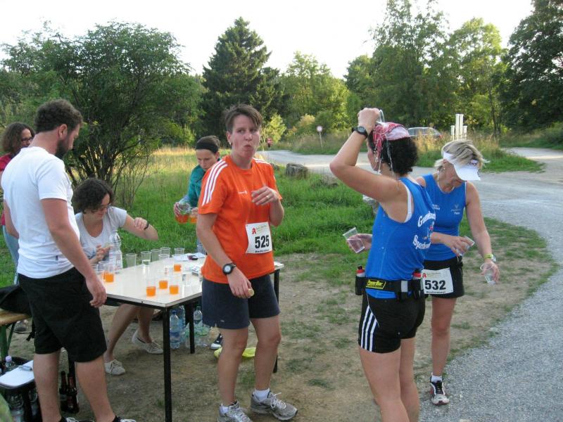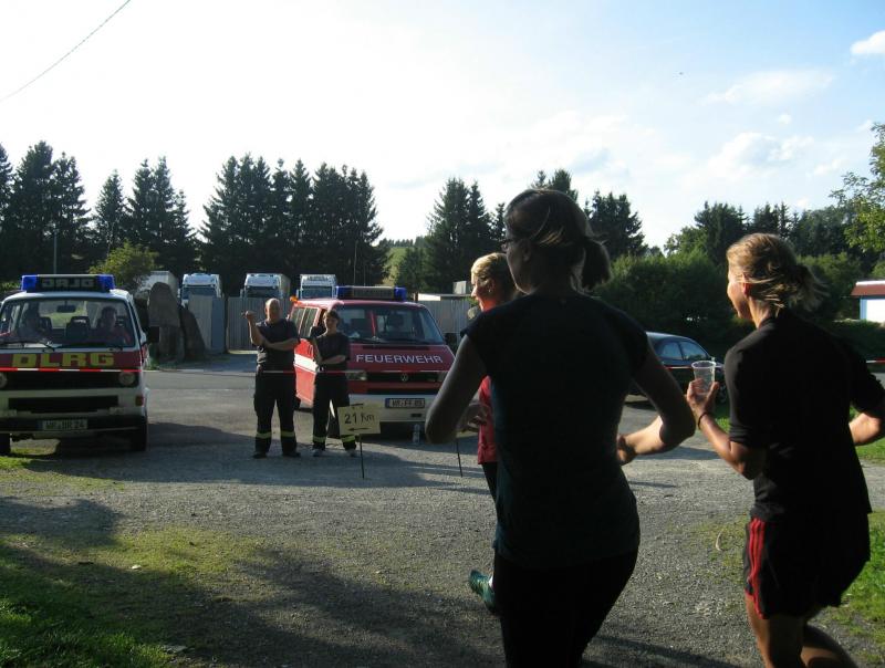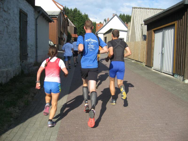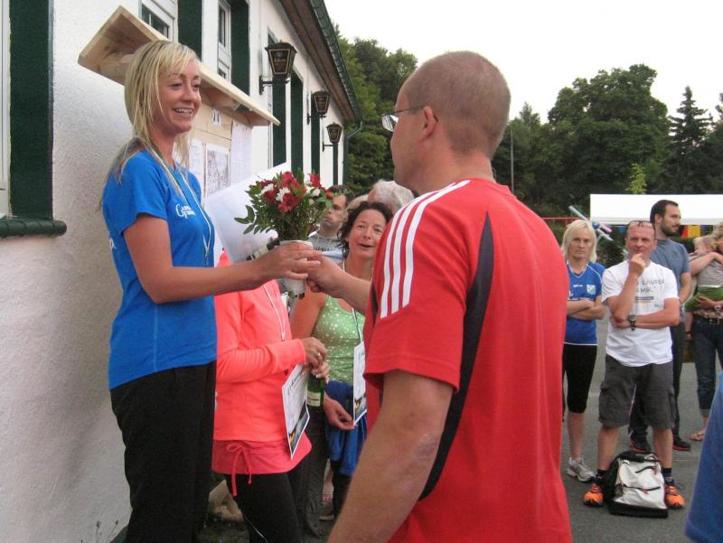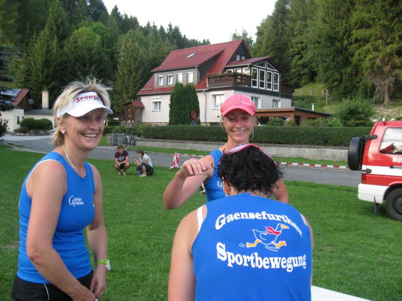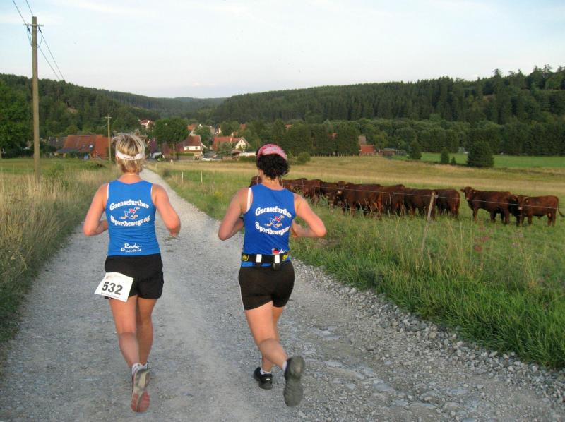 An dem Ort wo Kalte und Warme Bode zur eigentlichen Bode zusammenfließen, war der Start für 17:10 Uhr ausgeschrieben. Damit konnte das Kulturprogramm also nur vor dem Wettkampf absolviert werden. Nach einer Talsperrenbesichtigung und einem anständigen Mittagessen wurden in der Rübeländer Hermannshöhle, bei angenehmen acht Grad Celsius, die Läuferbeine ordentlich herunter gekühlt. Nach dem anschließenden Start in Königshütte mussten diese dann behutsam davon überzeugt werden, jetzt noch Schwerstarbeit zu leisten. Aber eine leichte Angst im Nacken trieb voran, denn die 21 Kilometer sollten möglichst ohne Umwege und vor Einbruch der Dunkelheit ins Ziel gebracht werden. Über herrliche Wald- und Wiesenwege war bald die Talsperre Königshütte erreicht. Gemeinsam mit den zehn Kilometerläufern kämpfte man sich hinauf zur Ruine Königsburg, von der es dann wieder rasant hinab ging. Nach 9,5 Kilometern trennten sich die Strecken und Renate Liedtkes erster Platz in der Altersklasse W60 war nur noch 500 Meter entfernt. Für die Langdistanz ging es wieder von 425 bergan auf über 500 Höhenmeter. Jens-Uwe Börner hatte sein Tun, den Frauenkampf fotografisch für die Nachwelt festzuhalten. Während sich Katrin Krebs an der Spitze zwischen Platz zwei und vier einsortieren musste, gelang es Petra Becker an Sabine Börner heran zulaufen. Nach dem Umrunden der Talsperre Mandelholz ging es in leichten Wellen an der Kalten Bode zurück nach Königshütte. Krebs brachte im Gesamtfeld der Frauen einen heiß erkämpften dritten Platz über die Ziellinie, Börner und Becker finishten am Ende wie so oft, gemeinsam. Wie für die Bode-Runners gemacht, ehrte der Veranstalter erfreulicherweise die Gesamtplätze eins bis sechs mit einer Medaille. Neben Krebs gingen die beiden letzten Frauen-Lorbeeren an Börner und Becker. Bei den Männern freute sich Triathlet Daniel Ragoß über den sechsten Platz Gesamt, was für ein Fest für die Gaensefurther Sportbewegung! Nach einer erfrischenden Outdoor-Dusche beschäftigte man sich mit der Auffüllung der Energiespeicher mittels Schmalzstulle und einem Alkoholfreien. Pünktlich zum Sonnenuntergang erfolgte die Rückreise: Keine Bode-Runners mehr auf den Strecken! Eine gelungene Premiere die hoffentlich im nächsten Jahr wieder in den Laufkalender passt…