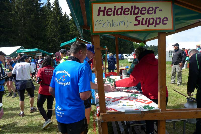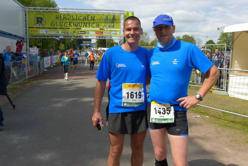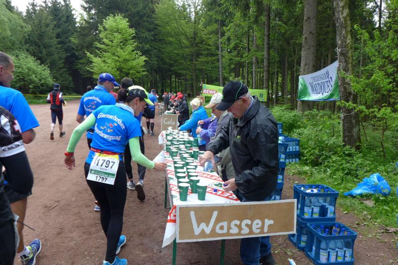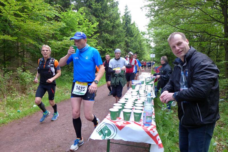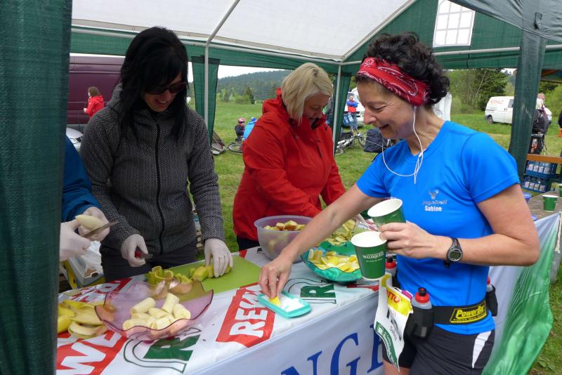 Die beiden Gaensefurther im Ziel hatten indes genug Zeit zum Duschen und warteten zusammen mit dem mitgereisten Fanblock auf die Ankunft der ausstehenden Ultraläufer. Aber auch nach acht Stunden suchte man vergebens nach den blauen Shirts, hätte man zumindest Jens-Uwe Börner längst zurück erwartet (Zielzeit 2013: 07:47:37 Stunden). Umso überraschter bejubelten die Freunde Katrin Winkler-Hindricks, welche nach starken 08:42:32 Stunden ihren allerersten Ultramarathon ins Ziel brachte. Nur sechs Minuten später und damit eine dreiviertel Stunde schneller als im vergangenen Jahr, war mit Sabine Börner auch die zweite Bode-Runners-Frau im Ziel. Bevor man sich dann langsam Sorgen machte, wurde das Männer-Trio zum Glück in der Ferne ausgemacht. Geschafft aber rundum zufrieden, hatten sie sich gemeinsam durchgebissen. Nicht zuletzt auch durch die üppig beladenen Verpflegungsstände. 09:16:00 Stunden Laufarbeit Nonstop hatten die Beine hinter sich. - Ein Ergebnis, dass man natürlich unmöglich so stehen lassen kann! Eine Neuauflage muss her, vielleicht in zwei Jahren. - Dann aber mit dosiertem Training und ohne Würstchen und Schmalzstullen auf dem Weg ins Ziel?