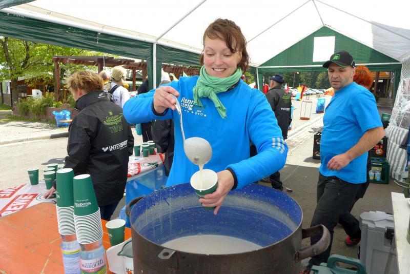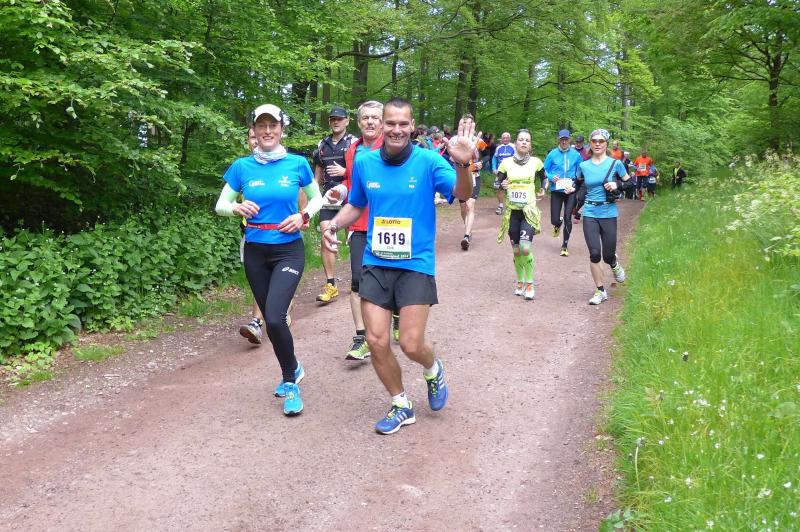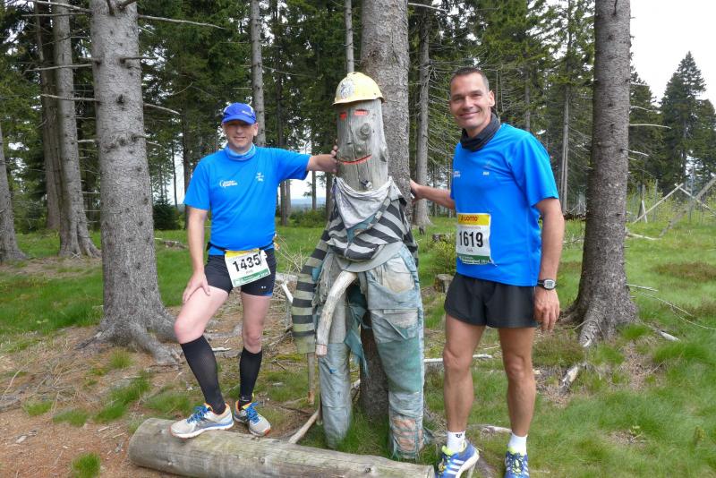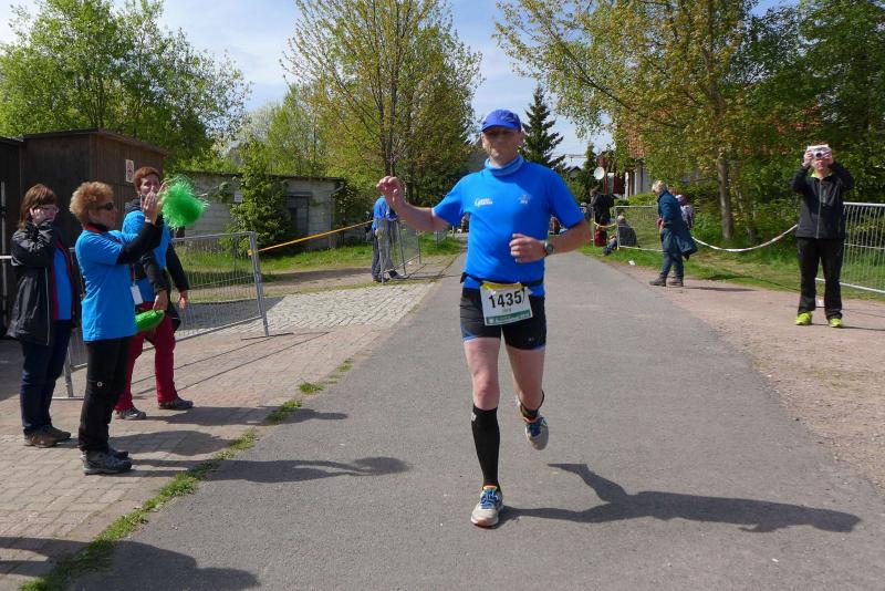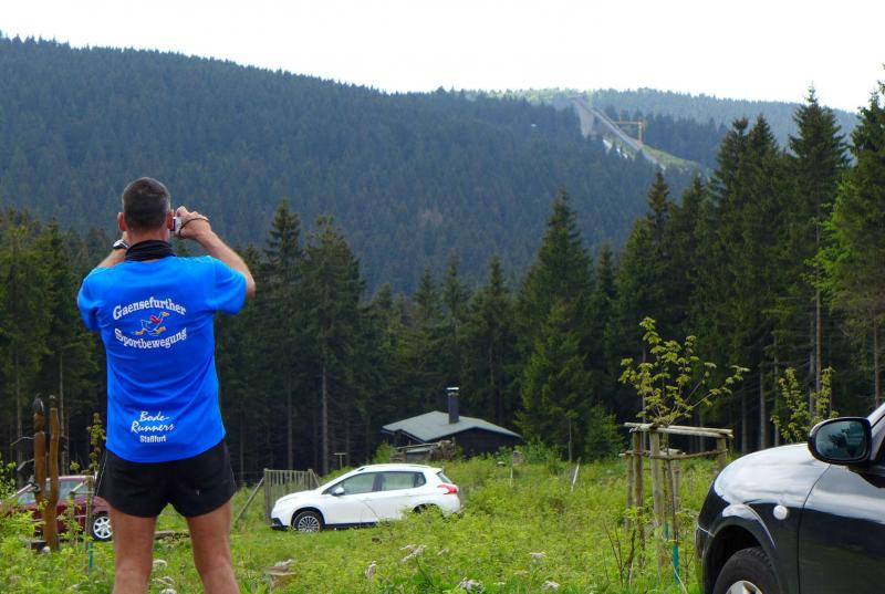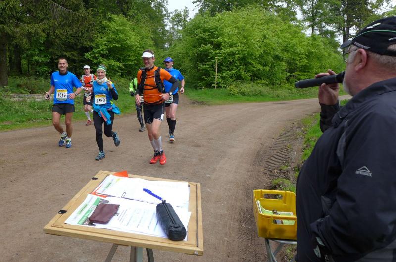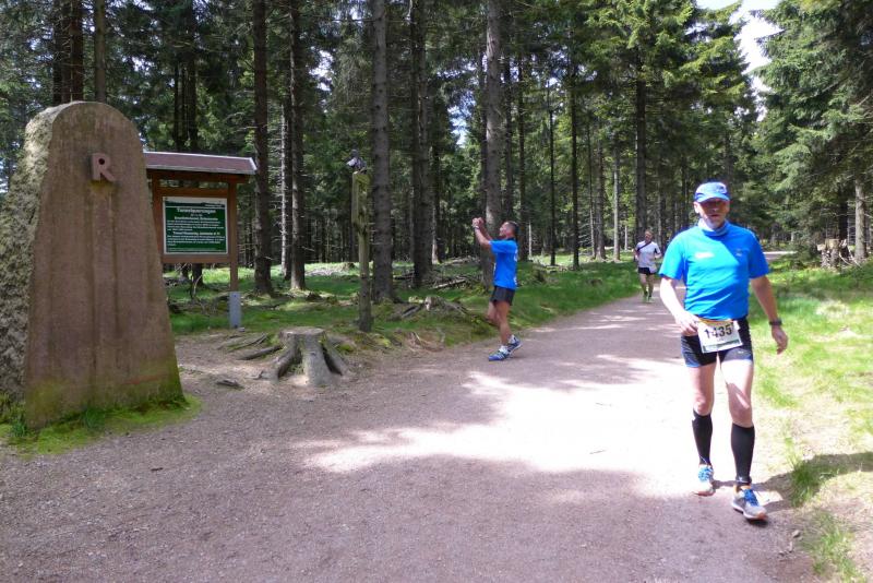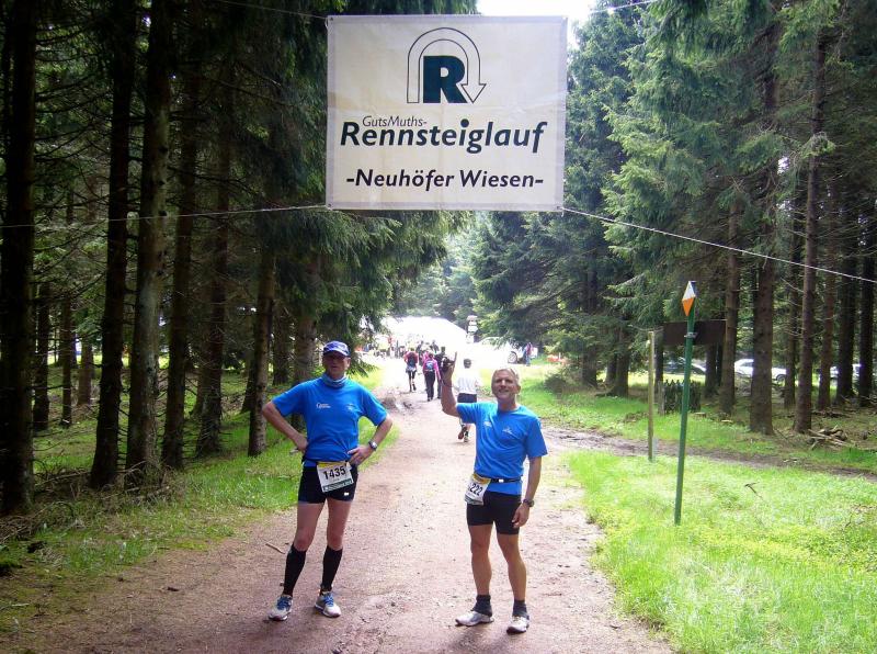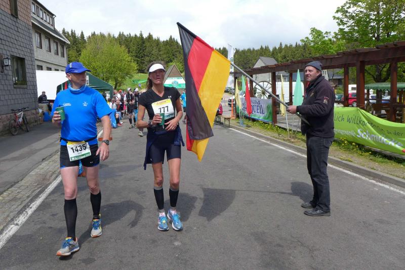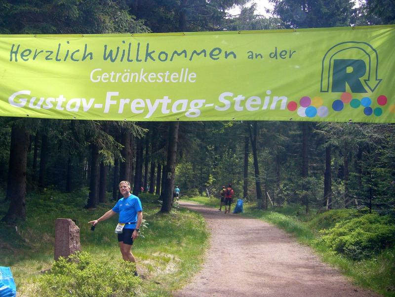 Dem frühen Startschuss um 6.00 Uhr im noch schlafenden Eisenach, gingen viele harte Trainingswochen voraus. Mehrere Marathons, Tempo- und Bergläufe waren absolviert, einzig mit dem Ziel, diesen Ultra-Marathon durchzuhalten. Während es für Jens-Uwe und Sabine Börner der vierte Start zu einem Ultralauf war, bewegten sich Katrin Winkler-Hindricks, Dirk Meier und Jörg Schäper jenseits der 42,195 Kilometer auf unbekanntem Terrain. Leicht fröstelnd, war Kilometer „1“ durch Eisenachs Innenstadt wohl der erste und auch gleich der letzte einfache Abschnitt. Schmunzelnd wurde ein aufgestelltes Ortsausgangsschild registriert, auf dem das Ziel Schmiedefeld mit 72 Kilometern ausgewiesen war. Von nun an ging es bis Kilometer 25,5 stetig bergauf, denn der Große Inselsberg mit 916 Höhenmetern wollte als erstes Etappenziel bezwungen werden. Alle fünf Bode-Runners waren noch dicht beisammen und hatten sich nach drei Stunden Aufstiegsarbeit noch wichtige Körner aufgespart. Bei kühlen fünf Grad Celsius verhinderte dichter Nebel den so hart erkämpften Panoramablick. Zur nächsten großen Verpflegungsstelle "Grenzwiese" ging es rasant bergab auf 746 Höhenmeter. „Das müssen wir nachher alles wieder hoch!“ resümierte Börner und schob sich zur Stärkung lieber noch ein Schmalzbrot in den Mund. Die Frauen beließen es bei warmen Tee und einem schmerzverzerrten Biss in gesalzene Zitronenviertel. Und weiter ging die Reise, jeder in seinem eigenen Tempo. Nicht alle Läufer freuten sich über die inzwischen wärmende Sonne, welche jedoch eine herrliche Sicht vom Höhenweg in das Umland ermöglichte. An der Verpflegungsstation „Ebertswiese“ war die Hälfte der Strecke geschafft. Einen Becher Haferschleim und ein letztes Foto mit Frau Sabine, denn von da an bekam er seine Gattin nicht mehr zu sehen. Beide Frauen spulten Kilometer für Kilometer ab, während in der Männerriege wichtige Fototermine oder Magen- und Muskelprobleme den Vorrang hatten. Ab Kilometer 60 nahm die Strecke einen holprigen Verlauf mit kleinen Hügeln, die inzwischen schon mächtig weh taten. Aber mit "Plänckners Aussicht" auf 973 Metern war der höchste Punkt des Rennsteigs erreicht und als kleine Bergprämie präsentierte man den Läufern die letzten Schneereste. Woher die wohl importiert waren?