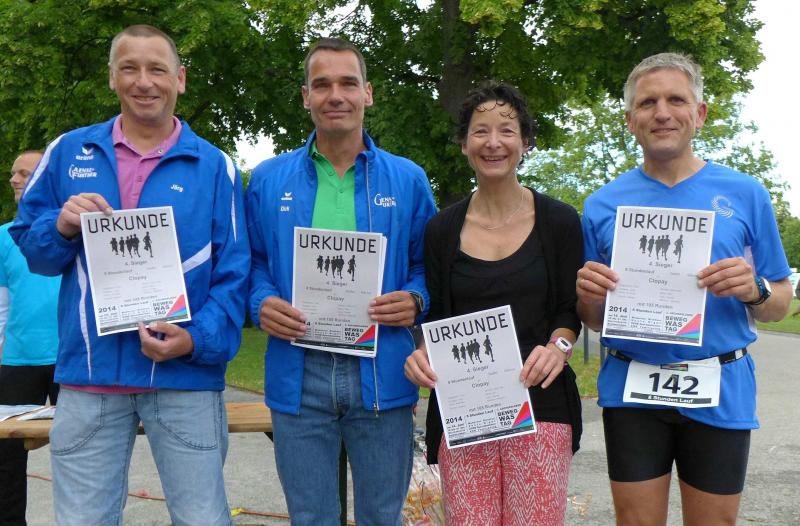 In leuchtend grünen Laufshirts starteten die Familien Eisfeld und Lampe für die Staffel „LEX Laufexperten“. Das Shirt der „Clopay and friends“-Staffel trug ein weiteres Achter-Team, bestehend aus vier Gaensefurther Sportlern und vier Mitarbeitern. Zu ihnen gehörte auch der Clopay-Firmenchef Stephan Meißner, dem natürlich die allererste Runde nach dem Startschuss vorbehalten war. Unter tobendem Applaus wurde der erste Wechsel auf den nächsten Staffelläufer vollzogen, die Routiniers wussten wie sie die Stimmung ordentlich anheizen konnten. Meißner, ehemaliger Tae-Kwon-Do Sportler, der in seiner Freizeit nur selten die Laufschuhe schnüren kann, hatte sich mindestens zwei Einsatzrunden vorgenommen. Bald waren alle Staffelteilnehmer einmal gelaufen, schon ging es wieder von vorne los. Die eingangs geplante Strategie, mehrere Runden hintereinander zu laufen und erst später auf den nächsten Teilnehmer zu wechseln, wurde schnell wieder verworfen. Nach der Laufrunde tat die Erholung gut, so dass der nächste Einsatz fast wieder im Sprinttempo absolviert werden konnte. Nun rief die berufliche Pflicht und Meißner beendete nicht ohne Stolz nach sechs absolvierten Einsätzen seine Teilnahme.