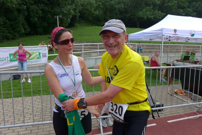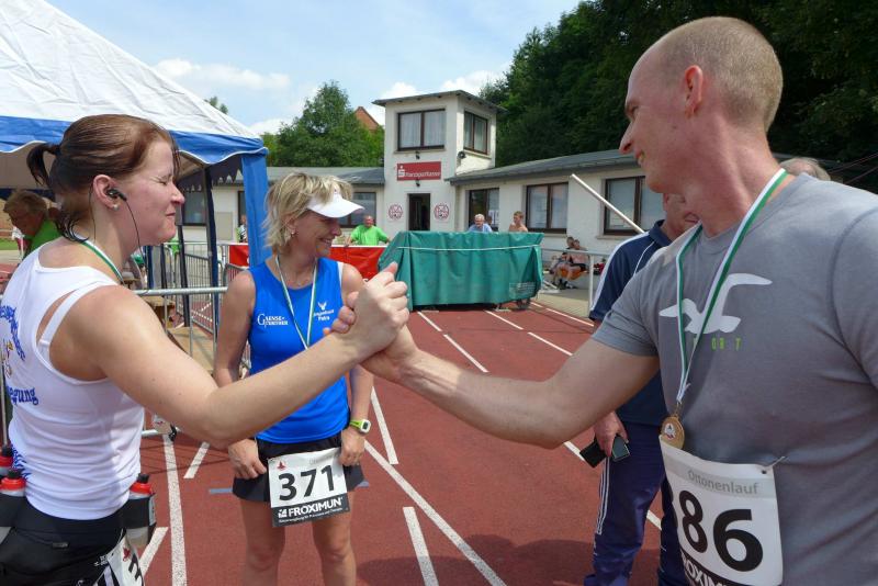 Drei weitere Starterinnen der Gaensefurther Sportbewegung nutzten den Ottonenlauf als erste lange Trainingseinheit für einen anstehenden Herbstmarathon. „Ein gutes, gleichmäßiges Tempo habt ihr Frauen immer!“ resümierte Ronald Kijok vom SV Concordia 1920 Nachterstedt und passte seinen Schritt den Bode-Runners an. Auch die Nordhessin Antje Hollstein reihte sich mit ein. Sie war mit der ganzen Familie angereist und belief auf diese Art und Weise die landschaftlich reizvolle Harzregion. Nach der Verpflegungsstelle am Osterteich trennten sich die Wege dann wieder. Petra Becker kam am besten mit den Bedingungen klar. Für jede Bergerklimmung belohnte sie sich mit einem kleinen Leckerli aus ihrem Laufgürtel und auch die Hitze konnte dem Blondschopf unter dem weißen Käppi nicht wirklich etwas anhaben. Sylvia Köhn und Sabine Börner stöhnten sich die Berge gemeinsam rauf. Nach 345 erreichten Höhenmetern und einem lauten Jubelschrei am Hagentalblick, ließen es die beiden hinab nach Bad Suderode locker austrudeln. Nun standen nur noch sechs heiße Kilometer an, die man Dank ausreichender Verpflegungspunkte gut getränkt absolvieren konnte. Die Eindrücke vom Zieleinlauf im Quedlinburger Stadion hielten noch an, da klatschte auch Kijok zufrieden ab. Sein grünes Finisher-T-Shirt, welches er sich extra für seine Ottonenläufe angeschafft hat, wird demnächst um einen weiteren Aufdruck ergänzt werden müssen. Unter respektvollem Beifall liefen viele weitere Sportler der Marathon- oder Ultradistanz über 69 Bergkilometer von Stiege bis nach Quedlinburg ein. Das wäre doch mal ein Gaensefurther Projekt für die kommende Laufsaison.