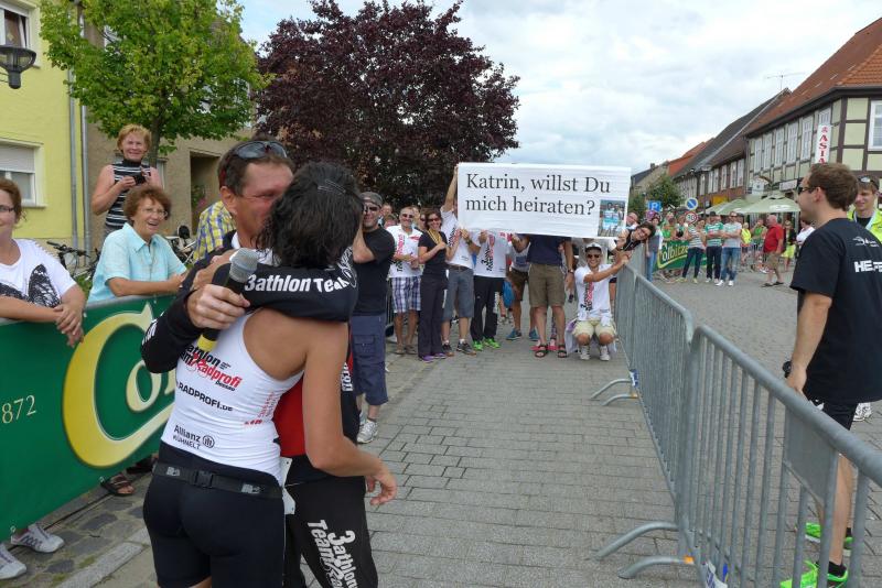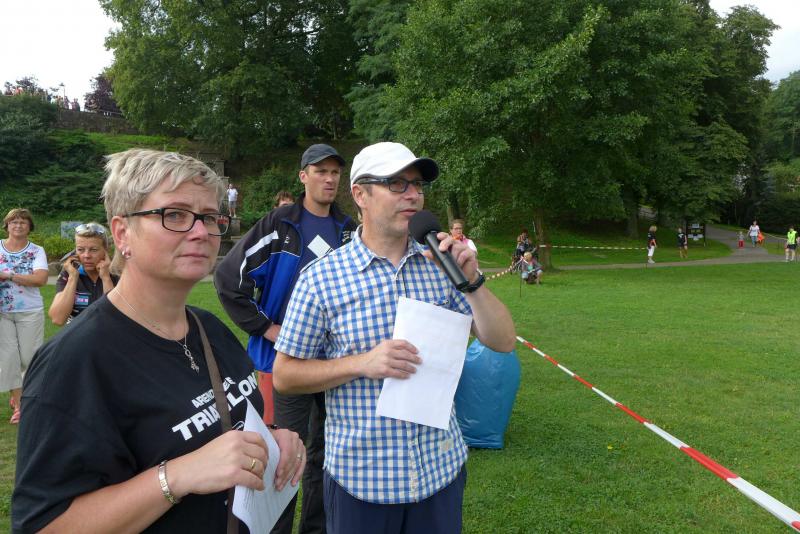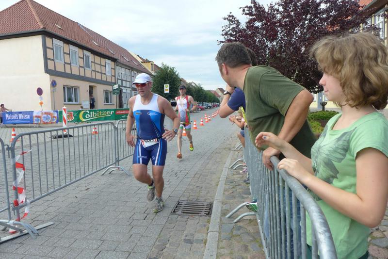Erst um 13.00 Uhr wurde es dann auch für die 133 Starter über die Jedermann-Distanz ernst. Für den Newcomer Thomas Mohr aus Löderburg, sollte der Triathlon in Arendsee ein unvergessenes Erlebnis werden. Hier war Sabine Börner in ihrem Element, denn nichts liegt ihr mehr, als Debütanten vom Sport zu begeistern. Herrlich unwissend, nahm Mohr dankend jeden Hinweis an, zumal Zeitvorgaben keine Rolle spielten und lediglich das Überqueren der Ziellinie als Maßstab galt. Ein letztes Mal brachte sich die „Queen Arendsee“ in Position und als Mohr seine Brille nach dem Sprung ins Wasser wieder auf der Nase platziert hatte, ging es auch schon los. Die Wellen hielten sich zurück und auch die Brille hielt bis zum anvisierten Ufer. Jens-Uwe Börner wechselte nach dem Schwimmen 15 Sekunden eher auf das Rad als Sabine – ein Schock, dass gab es im Triathlonkampf der Eheleute noch nie! Auf der 20 Kilometer langen Radstrecke begegnete man dem Debütanten Mohr dann zwei Mal. Das schwere Mountainbike erinnerte Börner an seine ersten Triathlon-Starts und die mitgenommene Capri-Sonne ließ Sabine immer noch leicht schmunzeln. Beruhigend, dass sich Mohr für die anstehende Fünf-Kilometer-Laufeinheit noch ein paar Sahnebonbons als Energiereserve bereit gelegt hatte. Beide Börners hatten es fast geschafft, da wechselte auch Mohr auf die Laufstrecke. Während die Wartenden im Zielbereich den rührenden Heiratsantrag eines Triathleten-Pärchens verfolgen konnten, war für Mohr Durchhalten angesagt. Und wie er durchhielt! Gepuscht durch die Sprecheransage und dem Applaus der vielen Zuschauer, legte Mohr auf der langen Zielgeraden einen sehenswerten Schlussspurt hin. Da wurden Reserven mobilisiert, die zweifellos ausbaufähig sind! Ein überglücklicher Thomas Mohr feierte seinen ersten Triathlon und die Sportler der Gaensefurther Sportbewegung feierten gerührt mit. Trotz Aussicht auf einen heftigen Muskelkater vereinbarten die Finisher eine Neuauflage im nächsten Jahr.