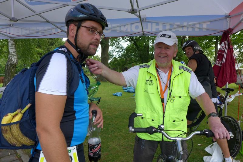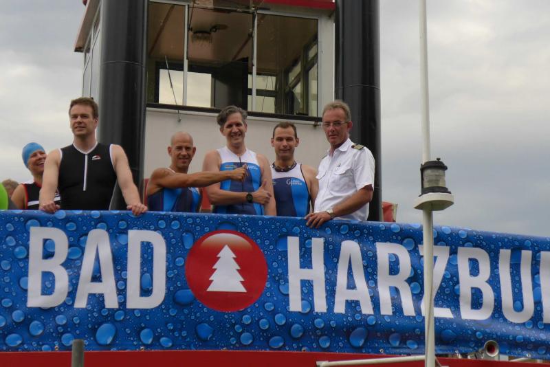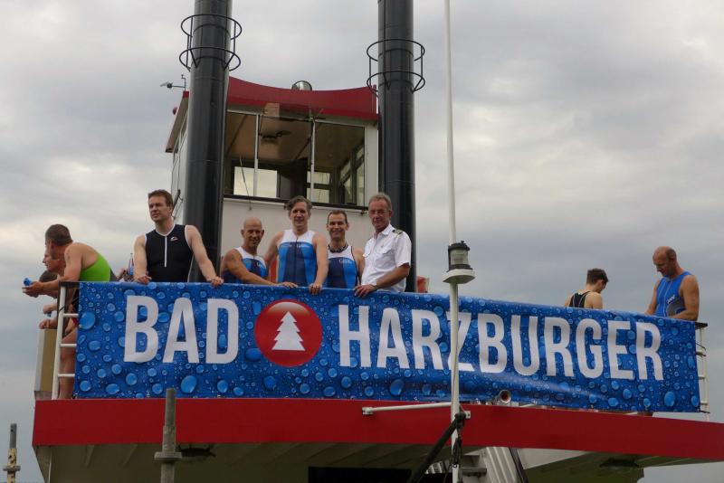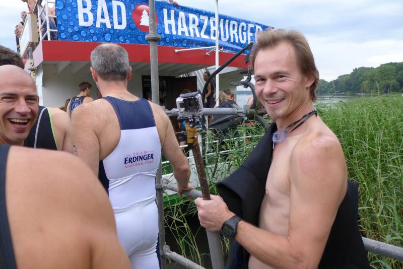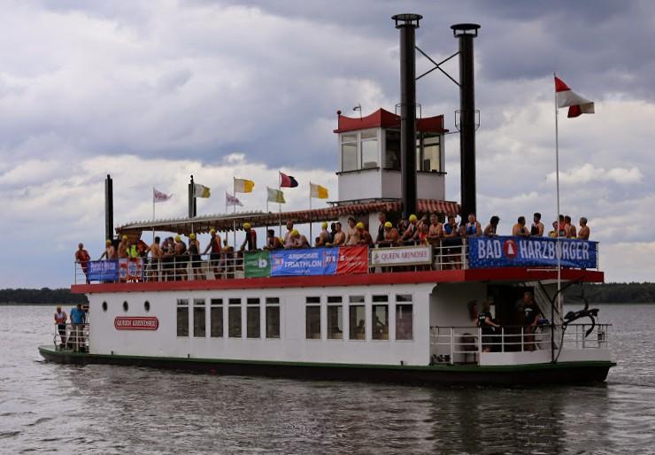 In der langen Warteschlange zur Abholung der Startunterlagen ging der Blick oft nach oben. Dicke Regenwolken thronten am Himmel und entleerten sich immer wieder in kleinen Huschen über den Arendsee. Die Teilnehmer der olympischen Distanz hatten den Kampf mit den Elementen aus dem Vorjahr noch gut in Erinnerung. Haarscharf entkamen sie damals dem tobenden See, was für einige bereits nach der Schwimmdistanz das unwiderrufliche Aus bedeutete. So bestand der Veranstalter in diesem Jahr auch wieder auf die Badekappenpflicht. Nur mit diesem auffallenden Utensil ausgestattet, war der Zutritt zum Schaufelraddampfer „Queen Arendsee“ freigegeben. Promi Antje Buschschulte begleitete als Zuschauerin und zum Daumen drücken ihren Ehemann Helge Meeuw auf der „Queen“. Während der Fahrt zum Start, lauschten die Teilnehmer angespannt den letzten Hinweisen der Wettkampfleitung. Dann ging alles ganz schnell.