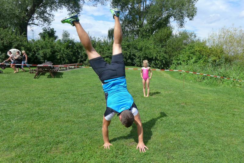 Nach einem Sprung in das kühle Nass sortierten sich die Schwimmer an der gedachten Startlinie. Ohne Neoprenanzug und mitten im See ausgesetzt, galt es nun das 1,5 Kilometer entfernte Ufer zu erreichen. Von den drei Startern der Gaensefurther Sportbewegung entkam Janko Schlenker als erster dem nassen Element. Trotz schlechterer Radzeit konnte er seinen Vorsprung vor Thomas Vetter über die Ziellinie retten. Vetter finishte nur 10 Sekunden hinter Schlenker. Als dritter im Bunde, beendete nach 2:44:10 Stunden Christian Anders ebenfalls seine olympische Distanz. Neben der Schwimmstrecke lagen 40 Kilometer Rad und eine Zehn-Kilometer-Laufrunde um den See hinter ihm.