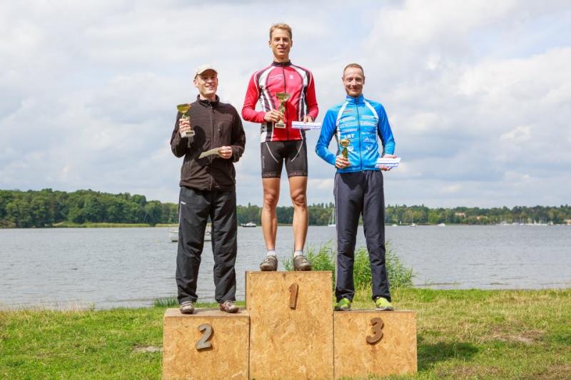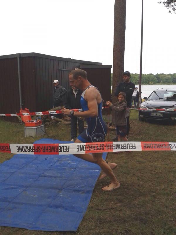 Am schönen Wannsee im Grunewald veranstaltetet ein Berliner Triathlonverein einen Triathlon über die Distanzen 1 km schwimmen - 24 km Radfahrern - 6 km laufen. Gemeinsam mit 50 weiteren Triathleten standen die beide pünktlich um 10:00 Uhr am Start zum 2. Crosstriathlon Berlin. Bei angenehmen Wassertemperaturen war das Tragen des Neoprenanzuges verboten. Es wurden zwei Runden zu je 500 m im Wannsee geschwommen. Blauwitz und Rosenmeier absolvierten das Schwimmen gemeinsam und hatten auf die Spitze ca. 3 min verloren, befanden sich aber immer noch im ersten Drittel des Feldes. Der Wechsel klappte bei beiden ohne Probleme und nun ging es auf 6 anspruchsvolle Radrunden durch den Grunewald. Zum Anfang jeder Runde ging es ca. 1 km auf sandigem Untergrund Bergauf und gespickt mit einer Tragepassage stellte sich der Radsplit als sehr anspruchsvoll heraus. Die beiden Gaensefurther kamen gut mit den Bedingungen zurecht und fuhren im Feld immer weiter nach vorne. Durch die Überrundungen anderer Teilnehmer hatte man den Überblick verloren und so sollte sich erst im Wechselgarten herausstellen an welcher Position man lag. Blauwitz kam als erster der beiden in die Wechselzone. Er zählte drei Räder und lag somit an Position vier. Die abschließenden 6 km Crosslauf gingen über 4 Runden. Schon beim Rauslaufen aus dem Wechselgarten sah Blauwitz den Drittplatzierten und machte sich auf die Verfolgung. Nun zahlte sich das harte Training der letzten Wochen aus. Schnell schloss er auf den Dritten auf und durch eine weitere Tempoverschärfung konnte er sich schnell lösen. Trotz bester Laufzeit an diesem Tag reichte es dann nicht mehr, die beiden vor ihm liegenden noch zu stellen. Auch bei Rosenmeier lief es auf dem Rad sehr gut und er wechselte als 13. auf die Laufstrecke. Hier konnte er von Anfang an gut Tempo machen und seinen 13. Platz im Gesamtklassement verteidigen. Am Ende wurde er mit dem Sieg in der AK 50 belohnt.