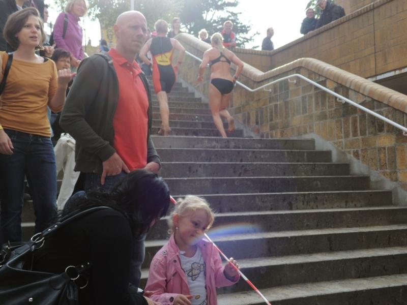 Endlich erfolgte der Wasserstart für die über 100 Teilnehmer. Das Feld zog sich gleich weit auseinander, so gab es beim späteren Einstieg in die Boote kaum Probleme. Allerdings war die erste von den zwei Kanurunden ziemlich turbulent. Die schon ungewöhnliche hohe Anzahl an Kajaks suchte den kürzesten Weg um die Wendebojen. Einige beendeten hier schon den Wettkampf, indem sie einfach umkippten. Die zweite Runde lief schon etwas ruhiger. Dann hieß es, Boote an Land tragen und unter dem Jubelschrei der Zuschauer 80 Treppenstufen hoch flitzen und alles ganz sicher, ohne schlapp zu machen. Danach ab aufs Rad und entspannte erste zehn Kilometer auf der Havelchaussee genießen. Allerdings ging es bald ans Eingemachte, denn der Grunewald hat ordentliche Hügel zu bieten, was ordentlich in die Beine ging. Auch diese anspruchsvolleren 15 Kilometer waren aber irgendwann zu Ende. Auf der abschließenden Laufrunde über schöne Waldwege konnte man zwar keine hervorragenden Zeiten mehr herauslaufen, am Ziel wurde man dafür wieder großartig empfangen.