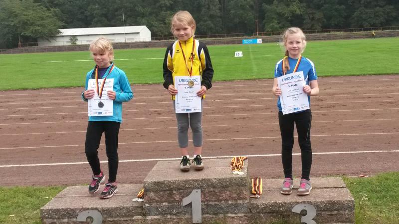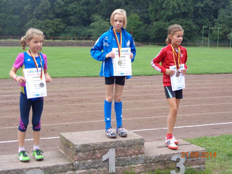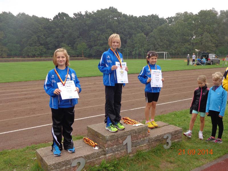 Die achtjährigen Mädchen des Vereins haben sich inzwischen zu einer Macht entwickelt. Michelle Otto glänzte dreimal mit Platz eins: im 50m Lauf, Weitsprung und 800m Lauf. Nur im Schlagballweitwurf musste sie drei Konkurrentinnen den Vortritt lassen, obwohl sie mit 22,07 Metern ihre PB um 3,5 Meter verbessern konnte. Eine der Konkurrentinnen war ihre Schwester Laura. Sie schaffte außer im Schlagballweitwurf mit 22,60 Meter (3.) auch im Weitsprung (2.) und 800m Lauf (4.) persönliche Bestleistungen und konnte zwei Mal zusammen mit Michelle einen Podestplatz einnehmen. Die Siegerin im Schlagballweitwurf hieß wie nun schon so oft Nina Ritter. Ein weiterer vorderer Platz gelang ihr im Weitsprung (3./PB), wo das Podest somit vollständig in Gaensefurther Hand war. Im 50m Lauf wurde Nina Fünfte und im 800m Lauf Siebte. Weil Fabienne Sämisch größenmäßig oft Nachteile gegenüber Gleichaltrigen hat, muss sie sich besonders anstrengen, um mithalten zu können. Das gelang ihr gut, aber für einen Spitzenplatz reichte es diesmal mit 2 Mal Platz sechs, acht und neun nicht. Den Höhepunkt bildete für die Mädchen der Altersklasse w8 die Staffel. Mit großem Engagement waren Nina, Laura, Fabienne und Michelle bei der Sache, siegten deutlich und durften sich über die begehrten Goldmedaillen freuen.
