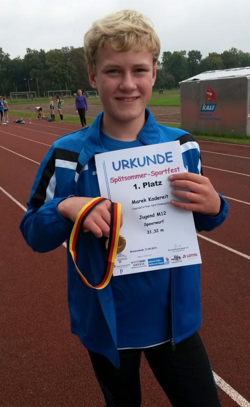 Marek Kadereit (m12), inzwischen auf die Wurfdisziplinen spezialisiert, konnte zwar seine Bestleistungen nicht verbessern, zeigte mit 8,25m im Kugelstoß und mit 31,32m im Speerwurf dennoch gute Leistungen und holte sich jeweils die Goldmedaille.