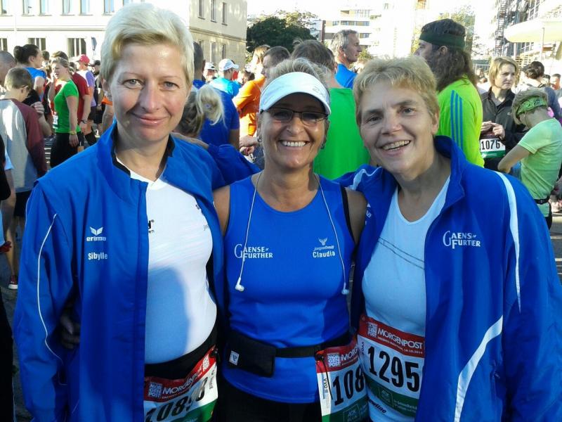 Zuerst gingen die 3 Läuferinnen auf die 10 km Strecke. Von der Augustusbrücke führte der Weg an die Elbe zur neuen Waldschlößchenbrücke und am anderen Elbufer zurück zum Ziel. Die Silhouette der Frauenkirche, der katholischen Hofkirche und des Schloßturms motivierte die Athleten für die letzten 3 Kilometer. Claudia Meier absolvierte mit 59:25 Minuten ihren ersten Lauf in Dresden mit einer guten Zeit. Verfolgt wurde sie von Sybille Schäper, die in 1:01:54 Std. persönliche Bestzeit lief. Was für eine Leistung! Im gewohnten Abstand kam Renate Liedtke nach 1:10:49 Std. ins Ziel.