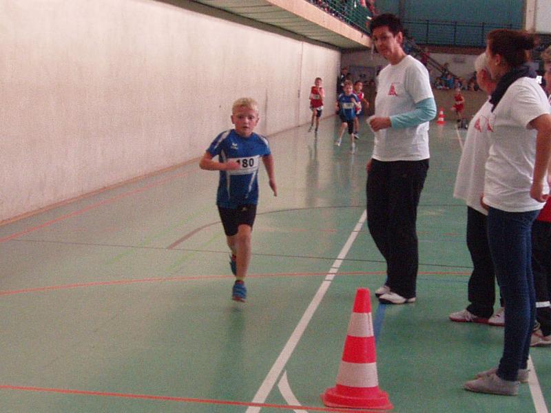 Der Sieg ging jedoch an Lukas Ladehoff, der sich mit 3:13,75 Minuten in einem Teilnehmerfeld von 9 Mitstreitern durchsetzte. Insgesamt waren 5,5 Runden zu laufen und schon von Anfang an ordnete er sich vorn mit ein. In Runde zwei überholte er dann den bis dahin Führenden und ließ sich bis zum Schluß von dieser Position nicht mehr verdrängen. Freudestrahlend lief er mit weitem Vorsprung durchs Ziel. Im 50m Lauf erreichte Lukas mit 9,26 Sekunden nicht den Endlauf und im Weitsprung wurde er mit 2,92 Metern Elfter.