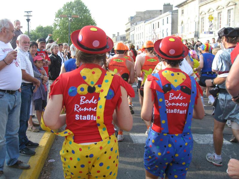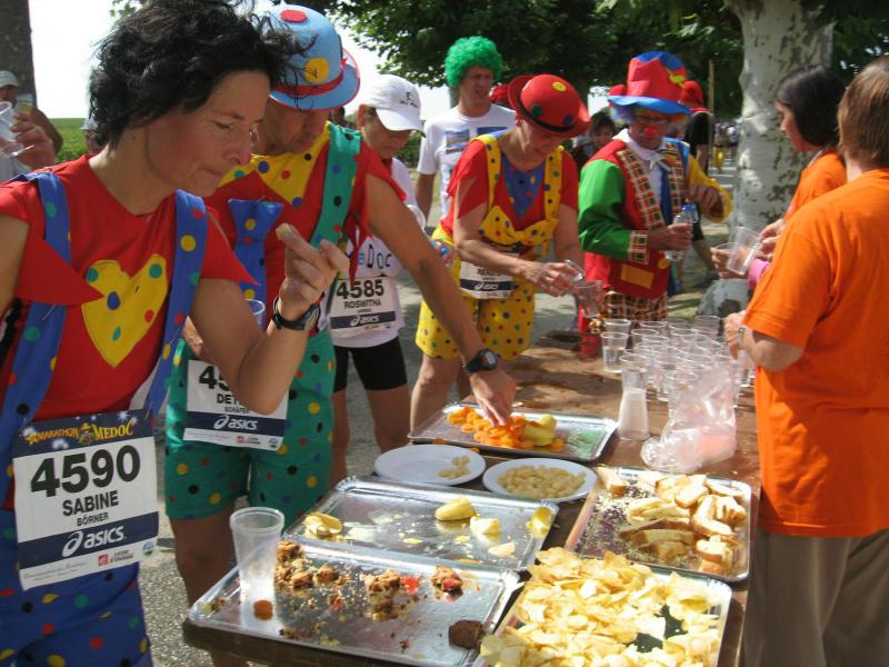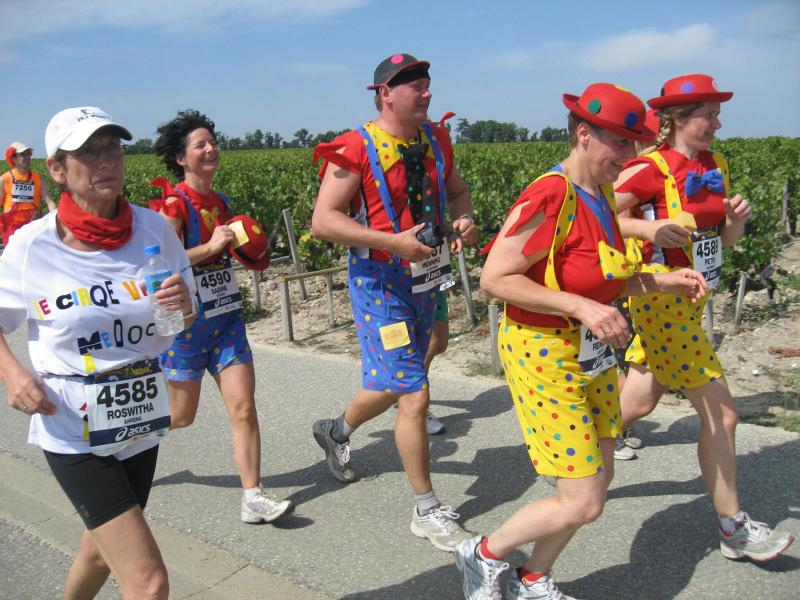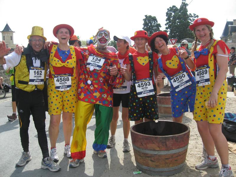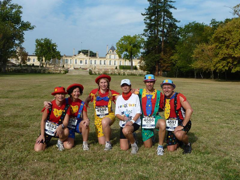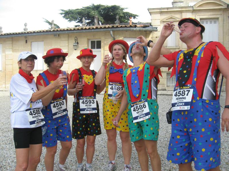 Neun Bode-Runners der Gaensefurther Sportbewegung gehörten zu den glücklichen Teilnehmern am Marathon des Chateaux du Medoc. Zusammen mit Sportlern aus Halberstadt, Aschersleben, Bernburg und Frankfurt bezog man im Feriendorf Lacanau an der südfranzösischen Atlantikküste Quartier. Ein sonnenverwöhntes Paradies unweit der Chateaus, welche sich durch die edelsten Weine dieser Erde ihren Namen machten. Erwartungsvoll begab sich die Gruppe in das Meer der knapp 9.000 Läufer und nach einem fast zwei stündigen Showprogramm, ging es dann wirklich auf die 42,195 Kilometer lange Weinverkostung. Der erste WC-Stopp erfolgte bereits vor dem ersten Kilometerschild, denn der eigene, gut gefüllte Getränkevorrat machte sich nach dem langen Stehen in morgendlicher Kälte bemerkbar. Kein leichtes Unterfangen, hatte man doch die ursprüngliche Laufbekleidung gegen ein Clown-Kostüm eingetauscht. Nachdem alle Hosenträger und Sicherheitsnadeln wieder an der richtigen Stelle waren und man inzwischen von schätzungsweise 4.000 Läufer überholt wurde, verließ die Gruppe unter dem Beifall zahlreicher Schaulustiger Pauillac. Eine Runde um die ersten Chateaus war zu absolvieren, bevor man nach 22 Kilometern den Ort wieder erreichen wollte. Ziel war, diese Strecke ziemlich zügig zu laufen, dann bei Kilometer 22 Renate Liedtke mitzunehmen und den Rest des Marathons gemeinsam zu genießen. Einen ersten erlesenen Tropfen Beychevelle gab es bereits bei Kilometer sieben. À la vôtre! Läufer aus der ganzen Welt prosteten sich genüsslich zu, die Bode-Runners vor jedem Schloss im Fotoshooting. Alle Verpflegungsstände waren üppig gedeckt. Neben frischem Obst reichte man den Läufern Salzgebäck, verschiedene Brot- und Käsesorten, Kuchen und Kekse, Trockenfrüchte, Wasser, Cola und natürlich immer wieder ein Becherchen Rotwein. Nach gut 2,5 Stunden erreichte man wieder Pauillac und Renate übernahm die Tempoarbeit. Mit den Chateaus Mouton und Lafite Rothschild nährte sich die Gruppe einem weiteren Höhepunkt. In der Parkanlage am prunkvollen Schloss, kredenzte man die edlen Tropfen natürlich in Gläsern. Eine logistische Meisterleitung für über 8.000 Läufer! Bereits mächtig dem Alkohol verfallen, ließen es sich einige Läufer nicht nehmen, im Teich der Rothschilds ein ernüchterndes Bad zu nehmen. Außer der zunehmend schwerer werdenden Beine verkrafteten die Staßfurter Läufer die ungewohnte Herausforderung bislang ohne Verluste. Eine Zielzeit von 6:30 Stunden war vom Veranstalter als Zeitlimit vorgegeben, dass müsste doch zu schaffen sein! Inzwischen war Kilometer 36 passiert, die Anstiege zu den höher gelegenen Chateaus lagen hinter den Läufern und es ging hinaus auf die Küstenstraße. Vor einem kleinen Imbisswagen drängte sich die Läuferscharr. Vom dicken Bayonner Schinken schnitt ein waschechter Franzose dünne Scheiben, die fluchs geschnappt, durch die Masse gereicht wurden. Ein leicht salziger Gaumenschmaus für den sich die kleine Pause gelohnt hatte! Nicht weit entfernt roch man bereits das nächste Highlight. Auf großen Tabletts wurden Austern mit Zitronen gereicht. Dazu servierte man den Läufern einen trockenen Weißwein. Für alle Bode-Runners eine Mutprobe die bereits im Vorfeld im Pflichtenheft aufgenommen wurde. Und eine Erfahrung, welche die meisten nicht noch einmal haben müssen. Da zog der Duft von frisch gegrilltem Rindersteak die Läufer schon eher zum nächsten Anlaufpunkt. Wer noch nicht genug hatte, konnte sich dazu auch einen feinen Cognac einschenken lassen. Nach diesen Schlemmermeilen und der brütenden Sonne sehnte man sich nach dem Ende. Nun kam auch noch ein Franzose mit einem riesigen Spiegel auf die Mädels zu. Danke, wir wissen wie es um uns gestellt ist, versuchte man zu übermitteln. Aber höflich lud er an den Straßenrand zur Auffrischung der Schminke ein, schließlich sollte beim Zieleinlauf alles perfekt sein. Nun hatte man also auch noch die Deutschlandfarben auf der Wange und nachdem alle noch ein Stieleis naschten, kamen auch die Kräfte wieder zurück. Ein Blick auf die Stoppuhr: „Das schaffen wir noch unter sechs Stunden!“ Gemeinsam genoss man nach 5:58 Stunden das Überqueren der Ziellinie, über 3.000 Läufer sollten noch folgen. Nicht umsonst spricht man vom „längsten Marathon der Welt“.