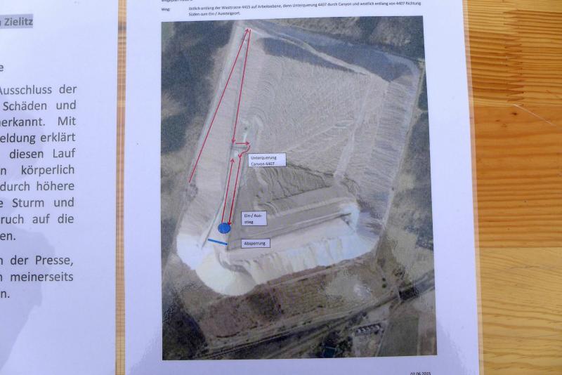 Nach 1,5 Kilometern und Steigungen bis zu 16 Prozent, war das Hochplateau auf 120 Metern erreicht. Das versprach Erholung und der frische Wind sorgte schnell für die nötige Abkühlung. In diesem Jahr war auf Grund der laufenden Produktion der Rundkurs über das Plateau nicht möglich. Damit fehlte leider der nördliche Blick in die weiten Elbauen. Stattdessen ging es immer schön dem Förderband folgend, bis hin zur riesigen Absetzanlage, welche den Abraum schließlich für die Ewigkeit platziert. Ein letztes Foto, ein letzter Ausblick, bevor es nach einer kurzen Schleife auf den gleichen Wegen rasant hinab ging.